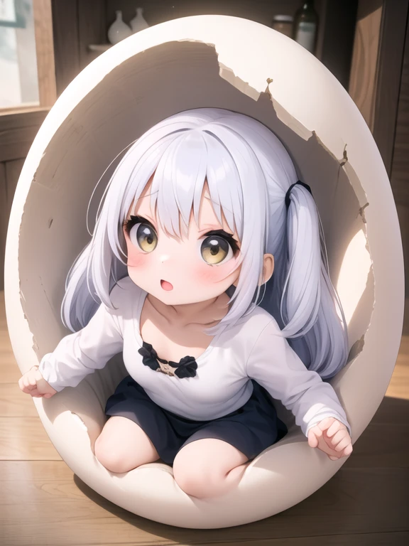 a little girl, 2 head body, chibi, giant cracked egg, head is sticking out of giant egg