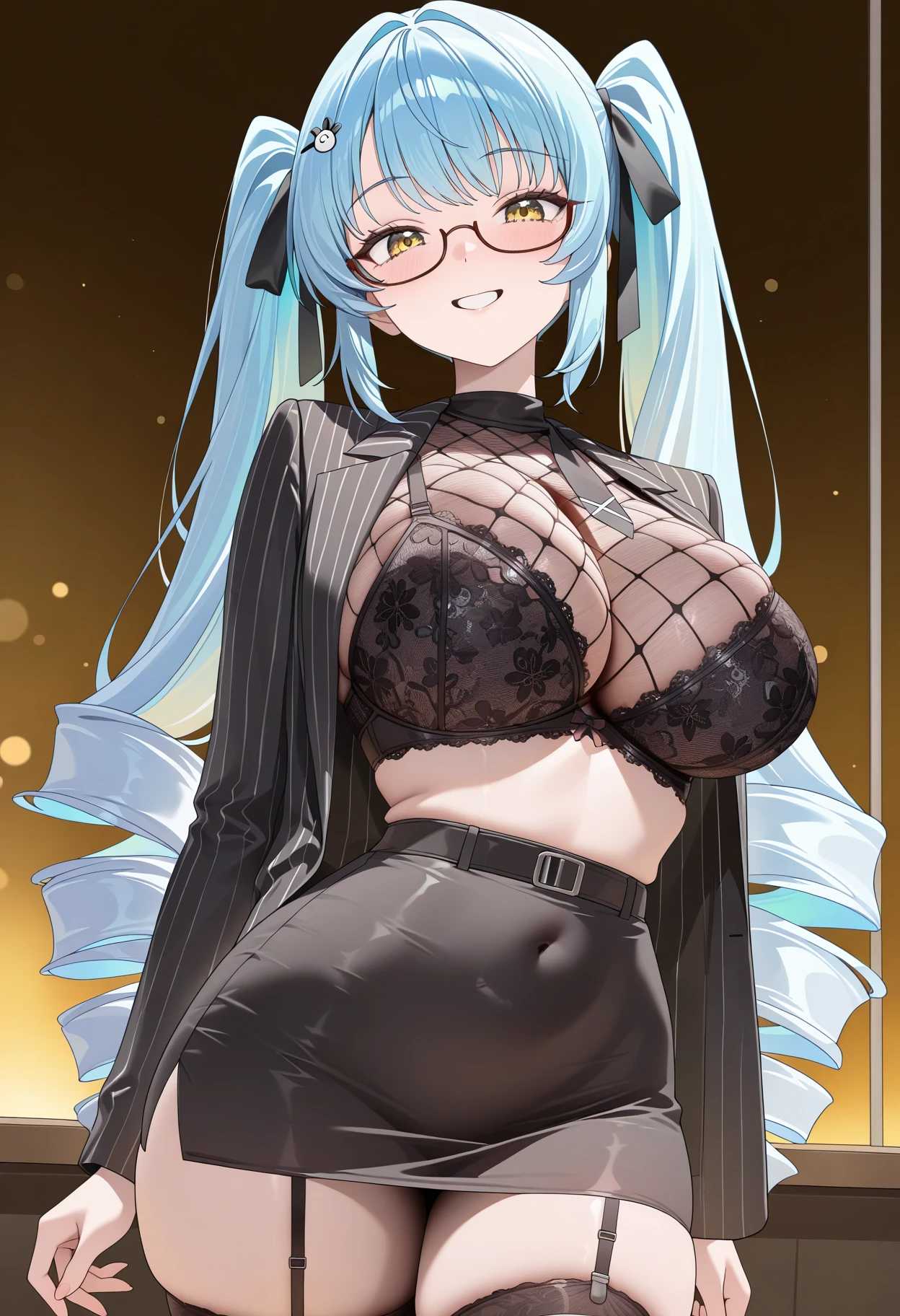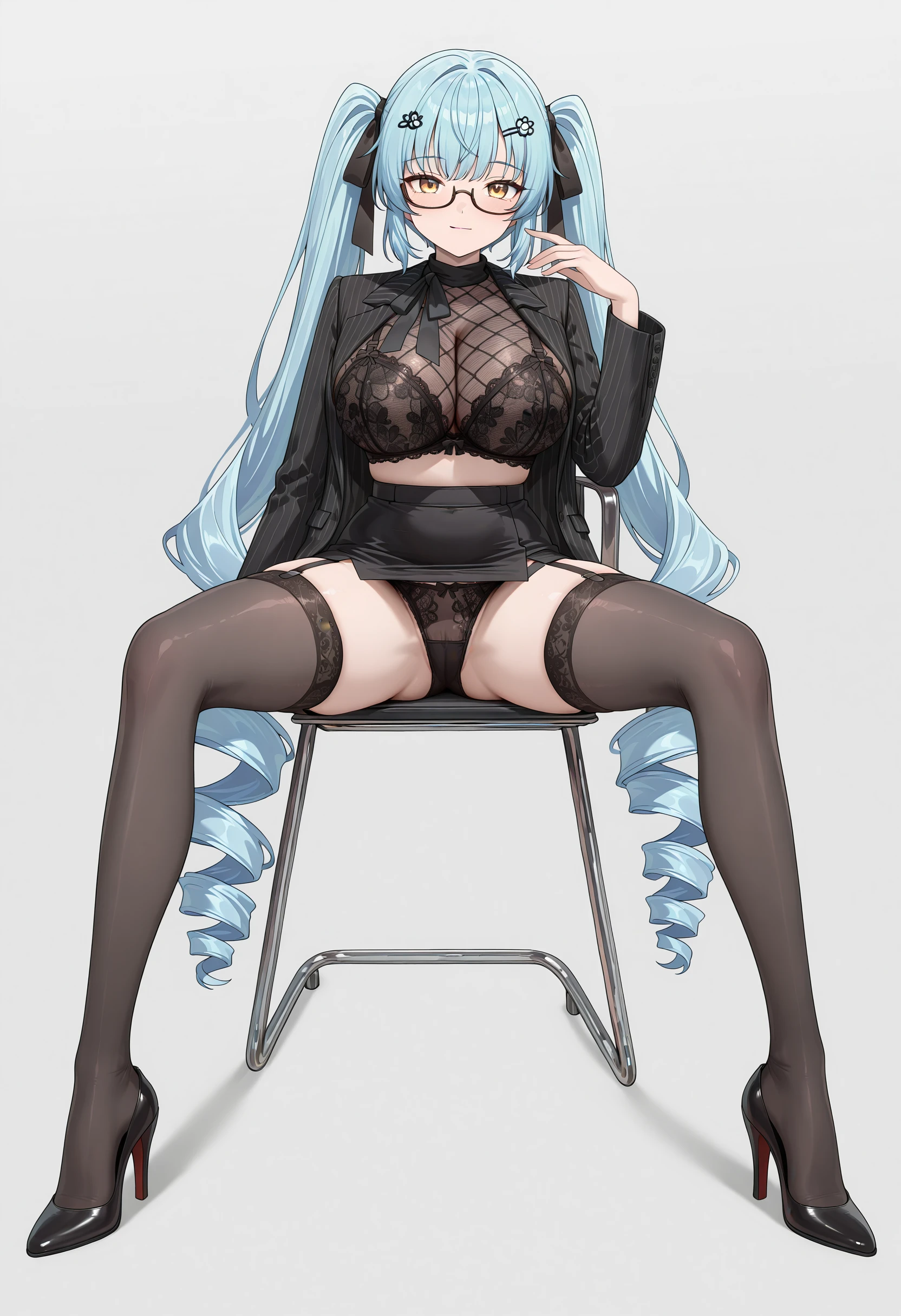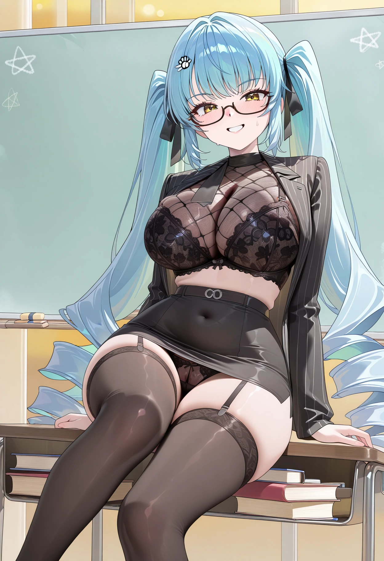 shiprivatylsson, blue hair, hair ribbon, twintails, drill hair, black ribbon, long hair, yellow eyes, semi-rimless eyewear, hair ornament, official alternate costume, teacher, large breasts, cleavage, striped jacket, black shirt, lace bra, lace-trimmed bra, black bra, fishnet top, see-through, black jacket, , long sleeves, garter straps, fishnets, underwear, pencil skirt, black skirt, miniskirt, black thighhighs, black footwear, high heels,