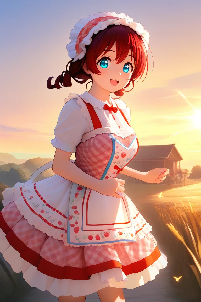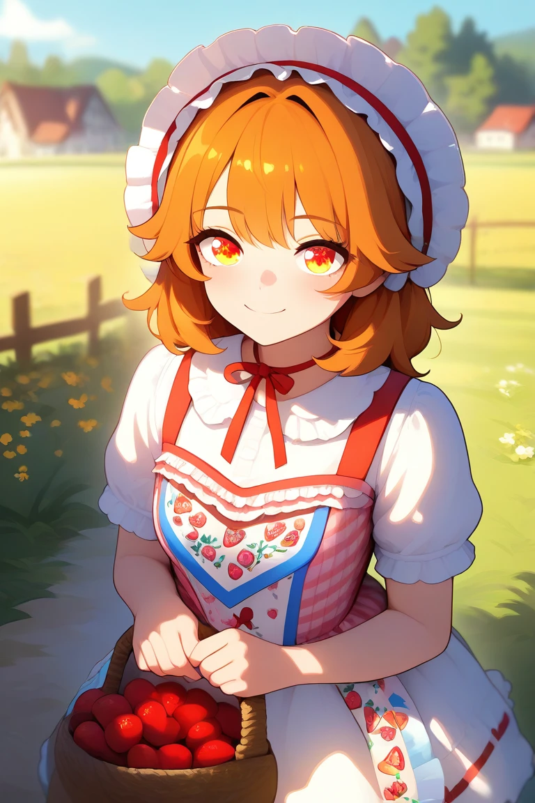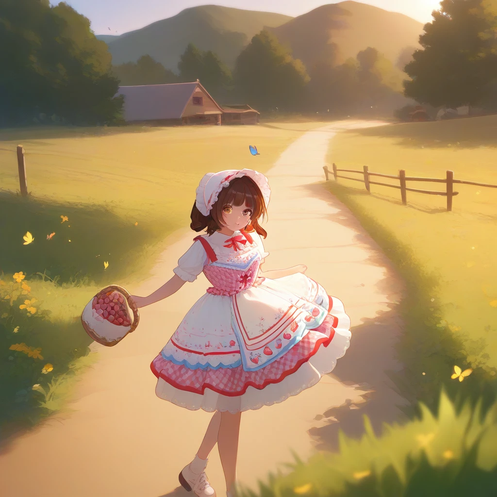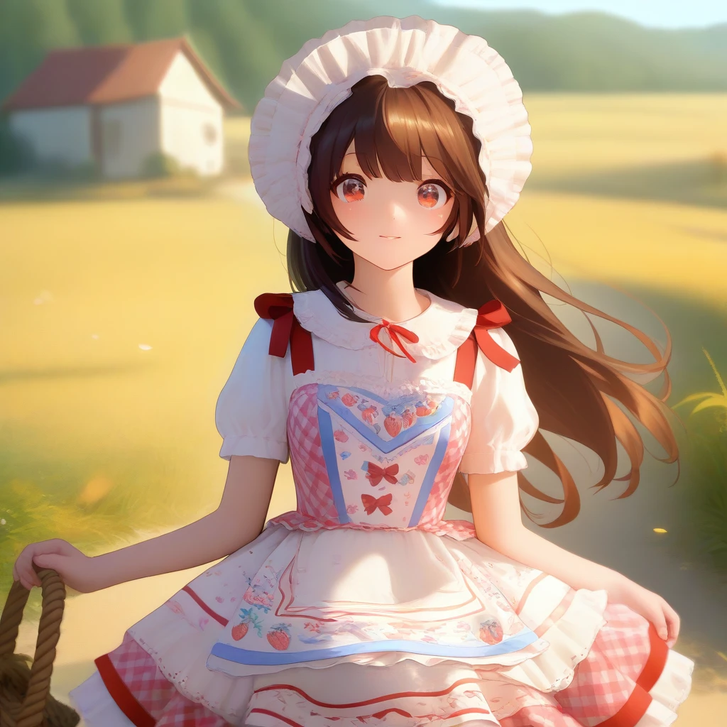strawberry_gothic_dress, puffy short sleeves, short sleeves, puffy sleeves, strawberry print, dress, frilled dress, lace-trimmed dress, layered dress, print dress, plaid dress, food print, ribbon-trimmed dress, frills, lace, lace trim, frilled shirt collar,headdress,bonnet,head scarf,apron,bow,red_bow,OtherPrompts: