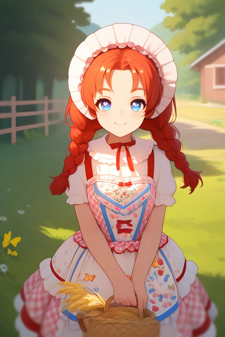 The outfit includes a bonnet-style headdress and apron elements, enhancing its classic and sweet aesthetic.