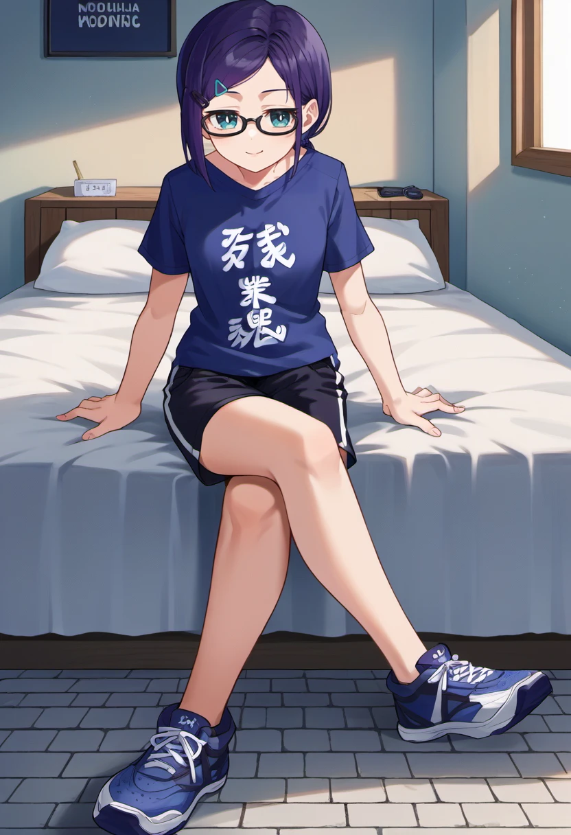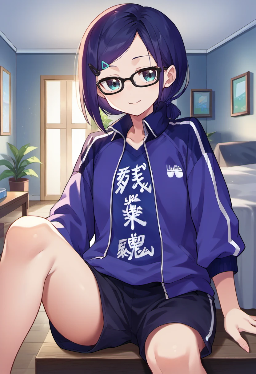 a-chan_3333, blue jacket, track jacket, blue shirt, open clothes, clothes writing, black shorts, black-framed eyewear, hairclip,