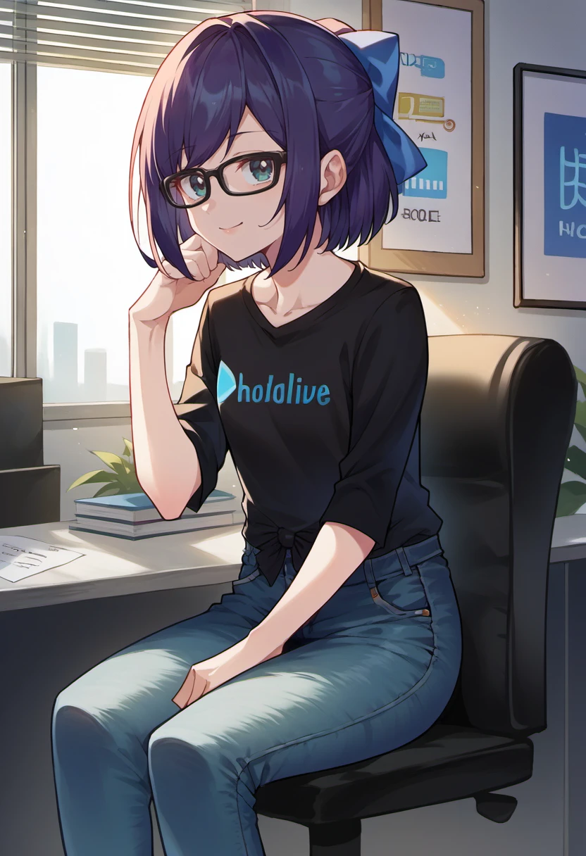 a-chan_1111, black shirt, print shirt, jeans, black-framed eyewear, blue bow, hair bow