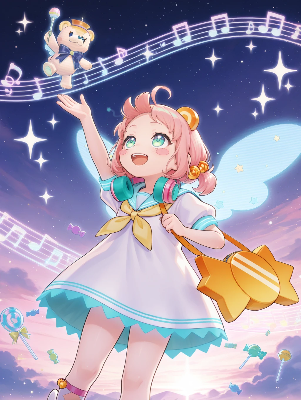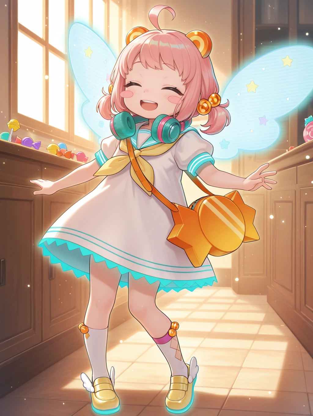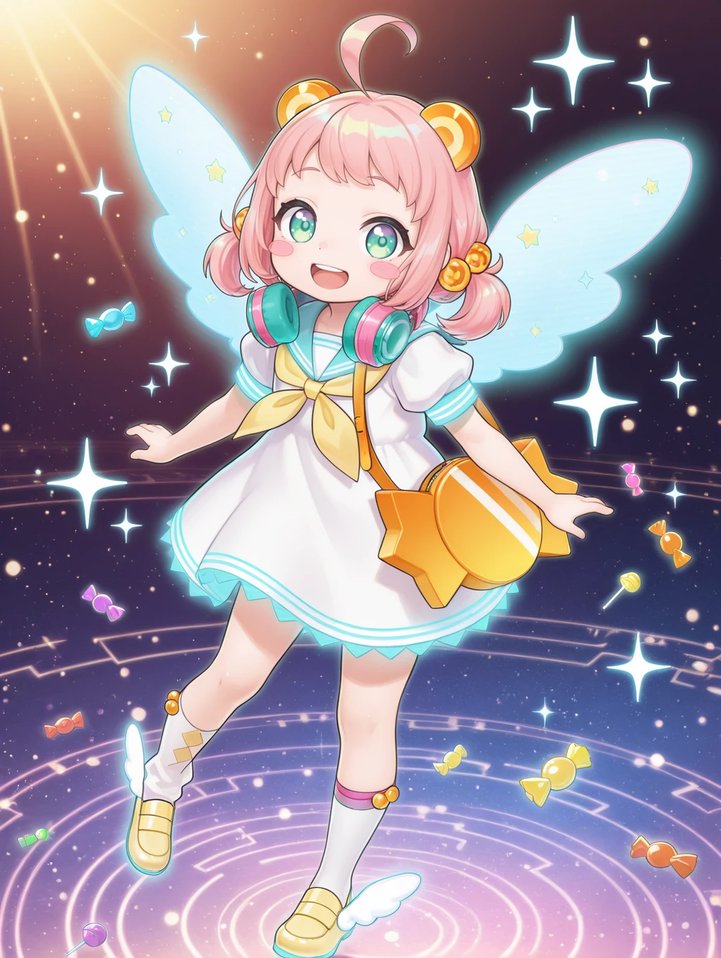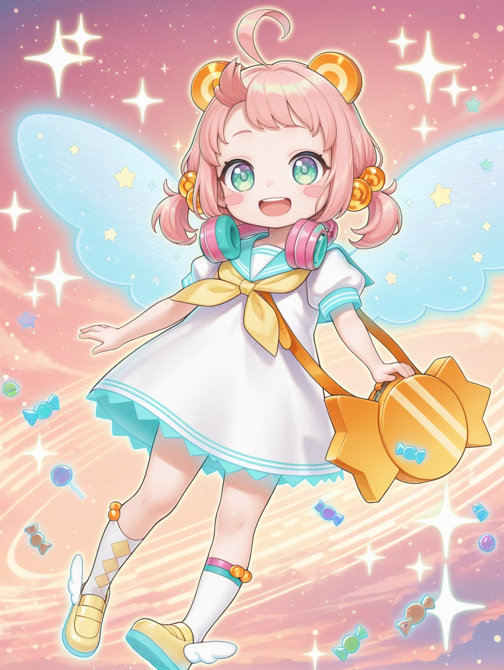 can-d, female child, glowing wings, white sailor dress, headphones around neck, yellow neckerchief, candy hair ornament, bear hair ornament, candy shoulder bag, asymmetrical legwear, yellow shoes