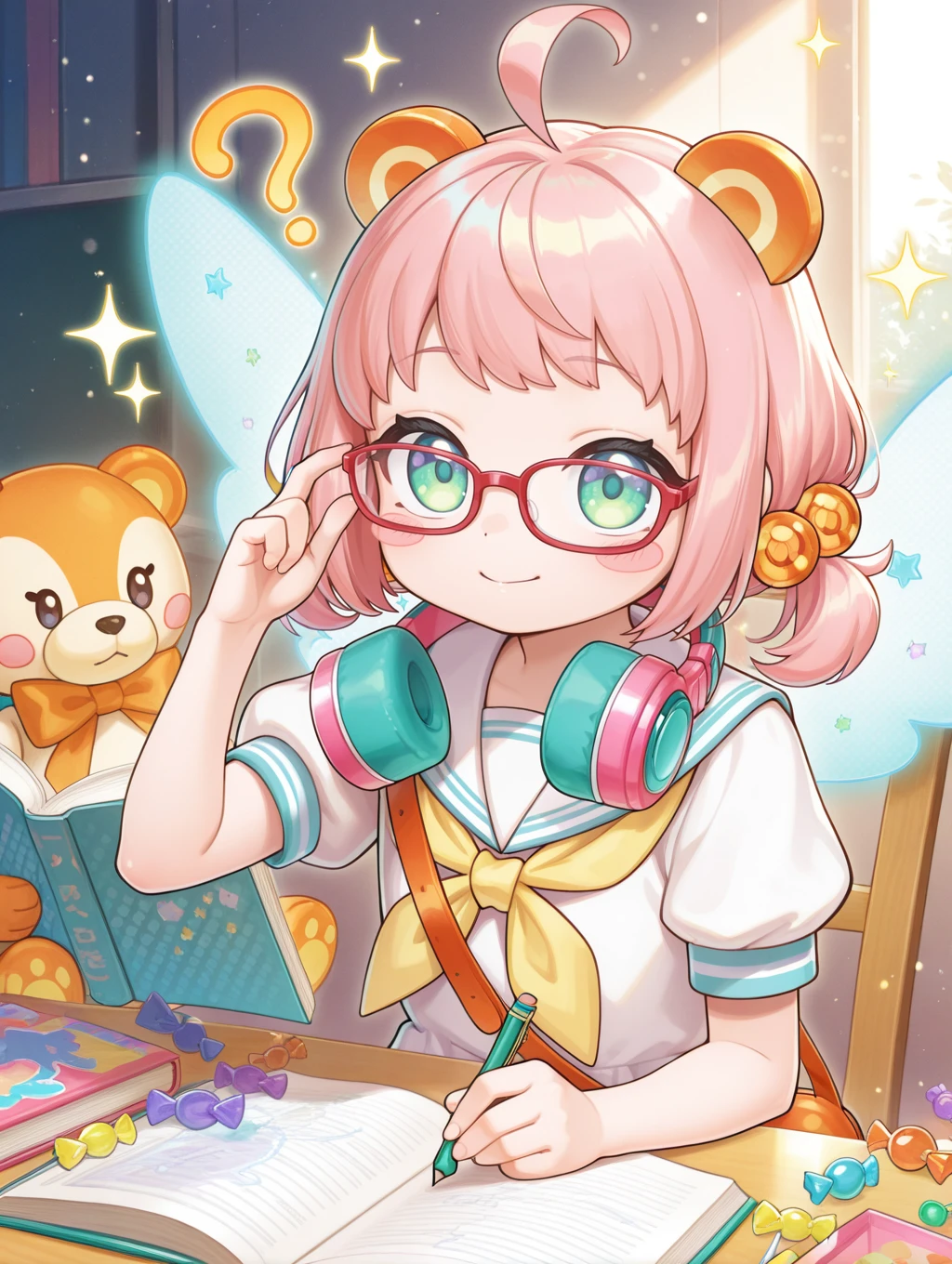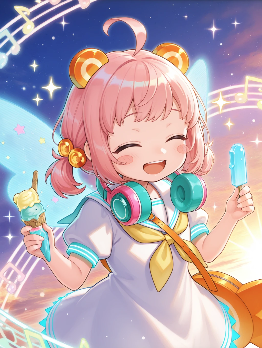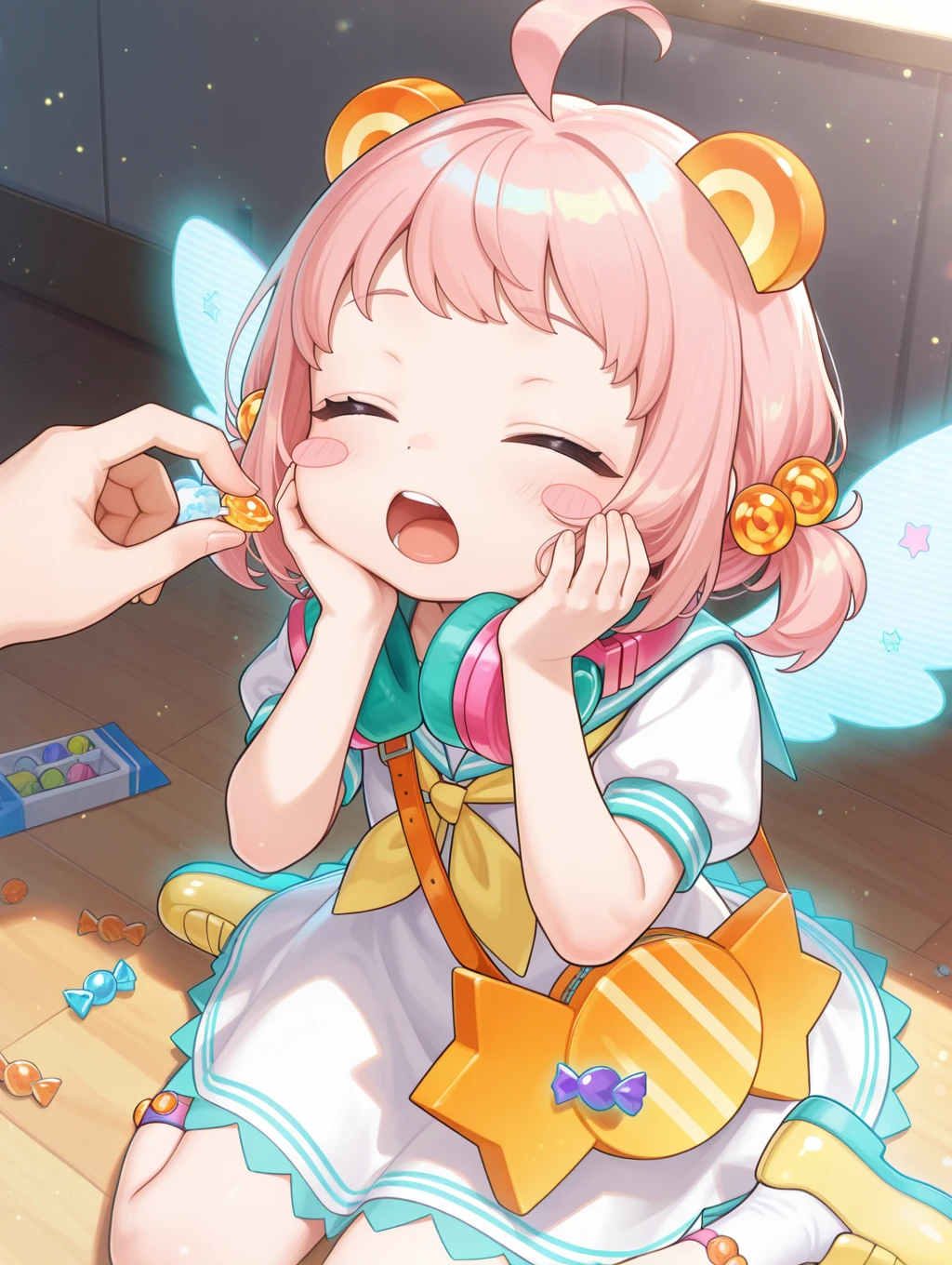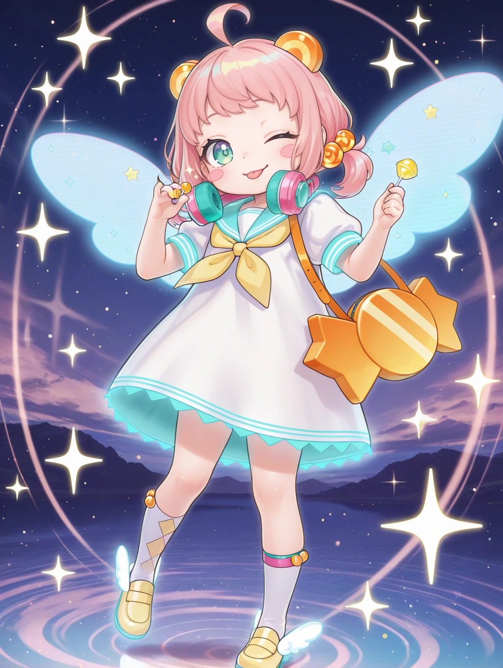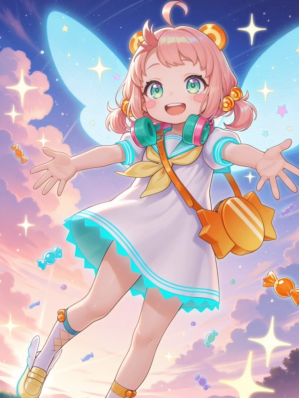 can-d, female child, glowing wings, white sailor dress, headphones around neck, yellow neckerchief, candy hair ornament, bear hair ornament, candy shoulder bag, asymmetrical legwear, yellow shoes