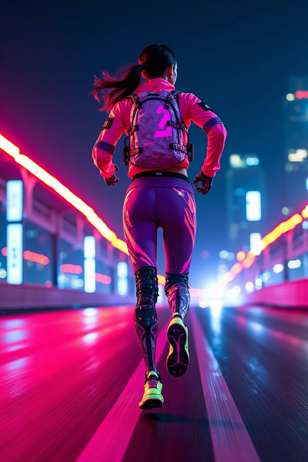 Neon color and cyberpunk style, a runner in neon - striped sportswear, cybernetic legs, sprinting on a neon - lit highway, motion blur to show speed.