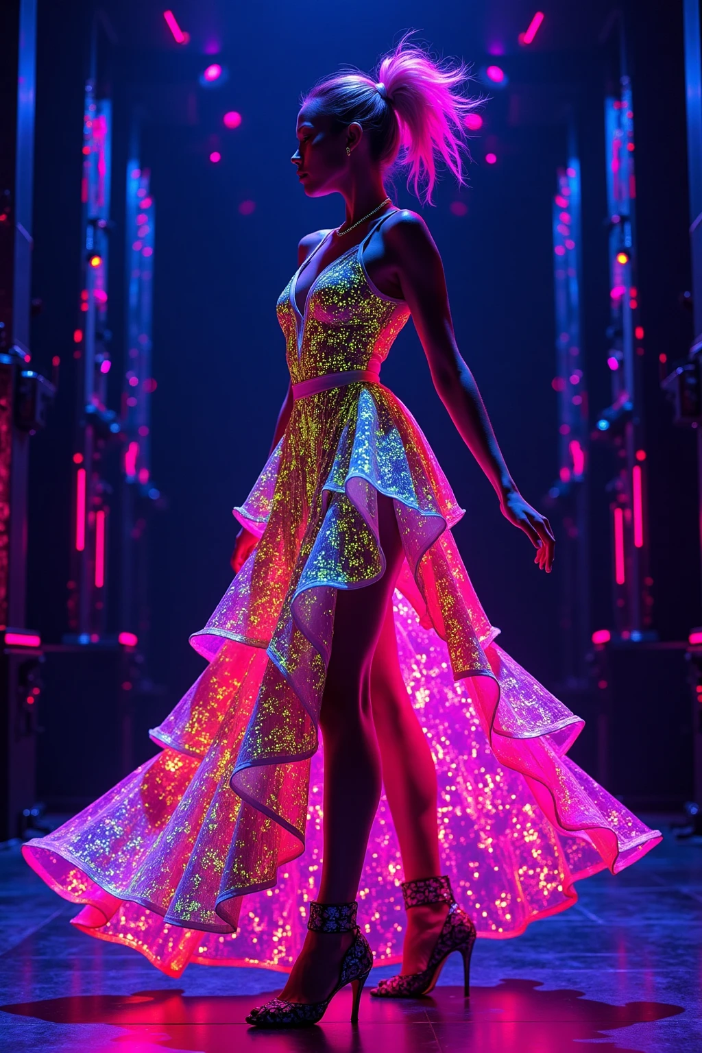 Neon color and cyberpunk style, a dancer in a flowing neon - colored dress, dress patterns like circuit boards, high - tech stage with flashing lights, silhouette effect.