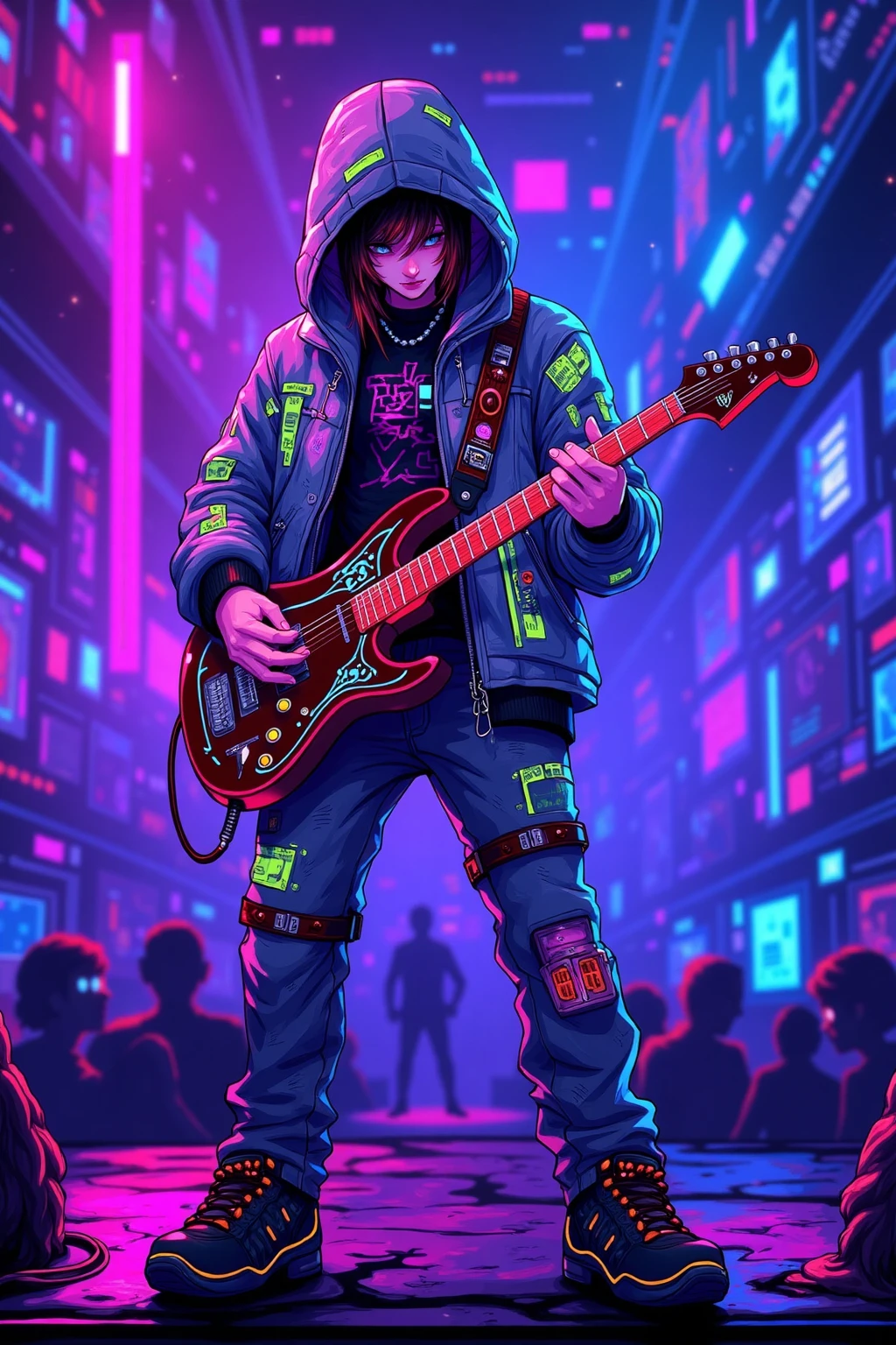 Neon color and cyberpunk style, a musician with a neon - lit guitar, wearing a jacket with pixel - art patterns, performing on a floating cyber stage, audience as glowing avatars.