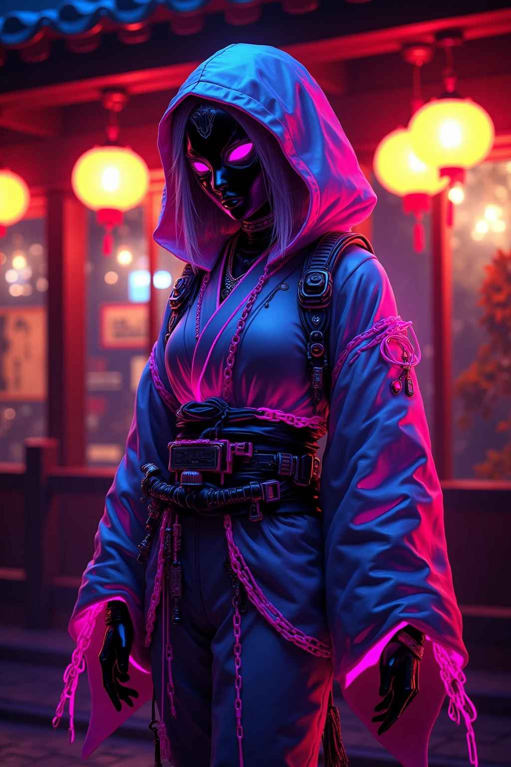 Neon color and cyberpunk style, a mysterious figure in a neon - trimmed kimono, wearing a mask, standing in a traditional - style cyber tea house, glowing lanterns.