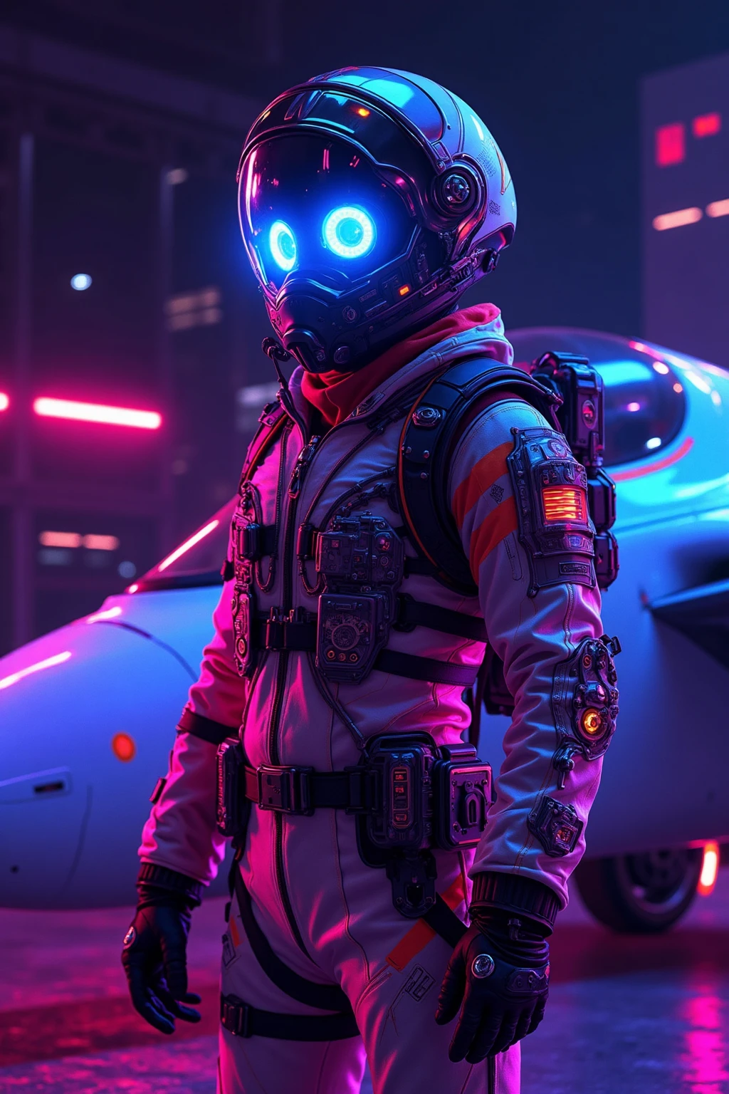 Neon color and cyberpunk style, a pilot in a neon - accented flight suit, helmet with a glowing visor, standing next to a futuristic aircraft, neon - lit hangar.