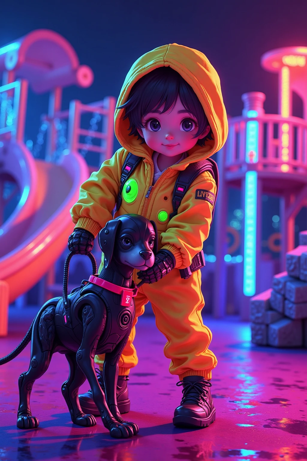 Neon color and cyberpunk style, a child in a neon - colored onesie, with a robotic pet, playing in a neon - filled playground, slides and swings glowing.