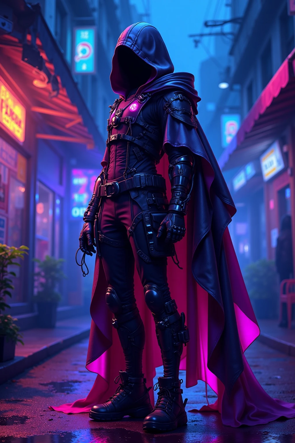 Neon color and cyberpunk style, a figure in a hooded cloak, cloak edges shimmering neon, cybernetic arm, standing on a neon - lit street corner, misty background.