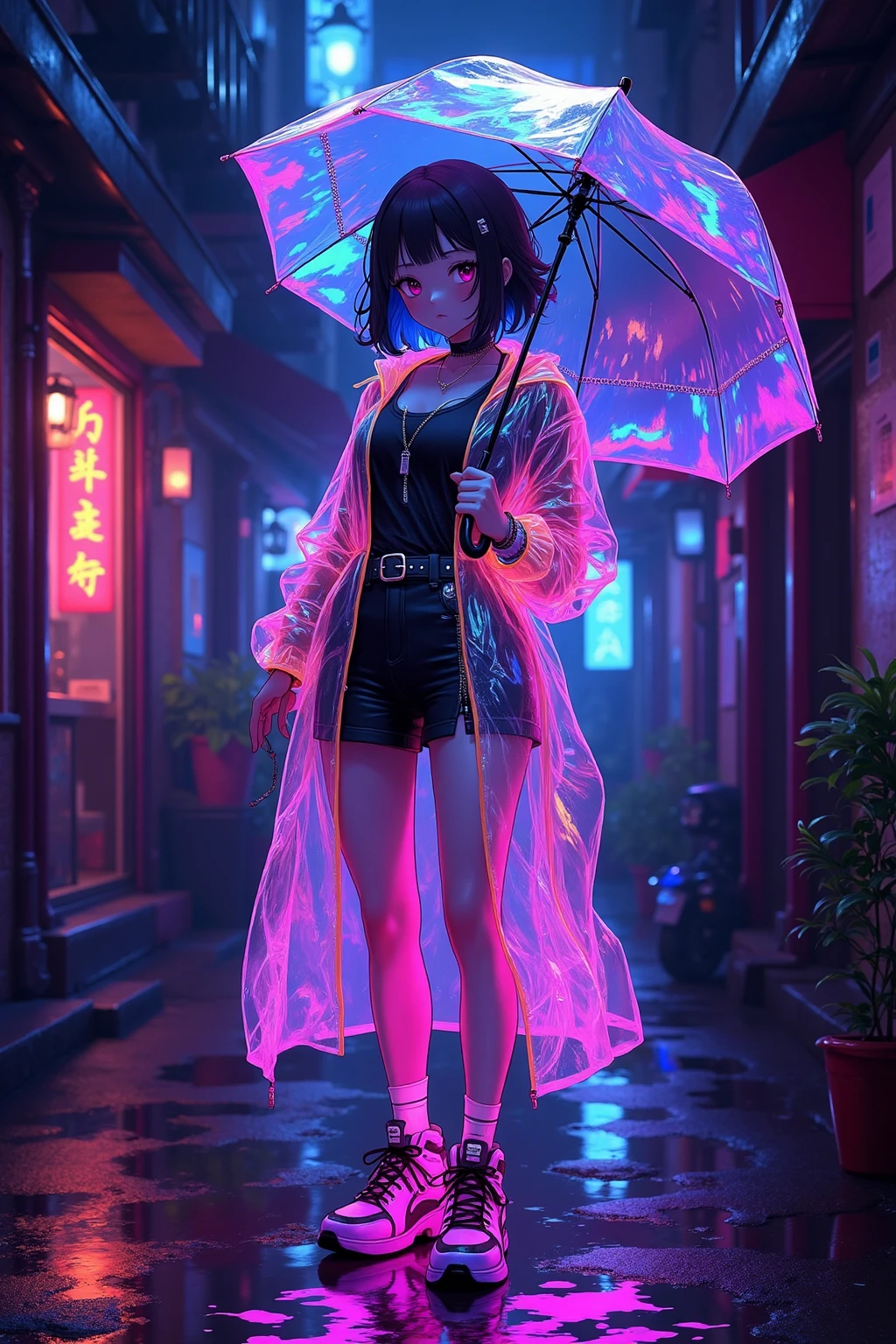 Neon color and cyberpunk style, a girl in a transparent, neon - lined raincoat, carrying a holographic umbrella, standing in a neon - soaked alley, puddles reflecting lights.