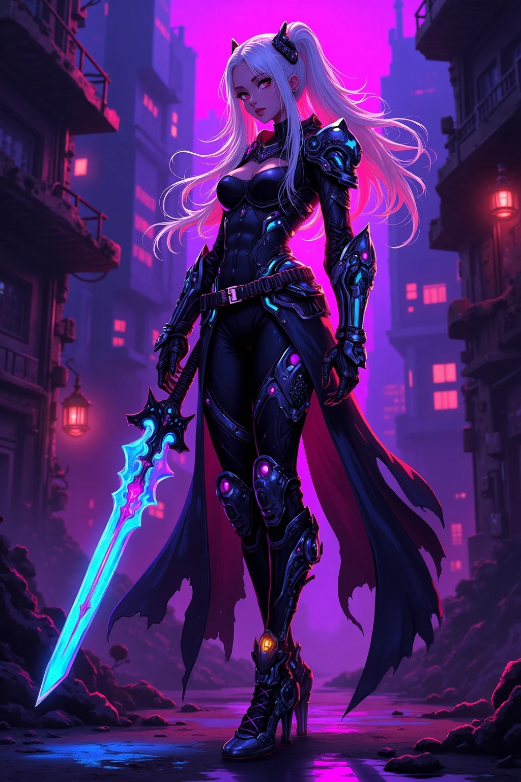 Neon color and cyberpunk style, a character with long, glowing hair, wearing a futuristic armor with neon accents, holding a plasma sword, in a ruined cyber city.