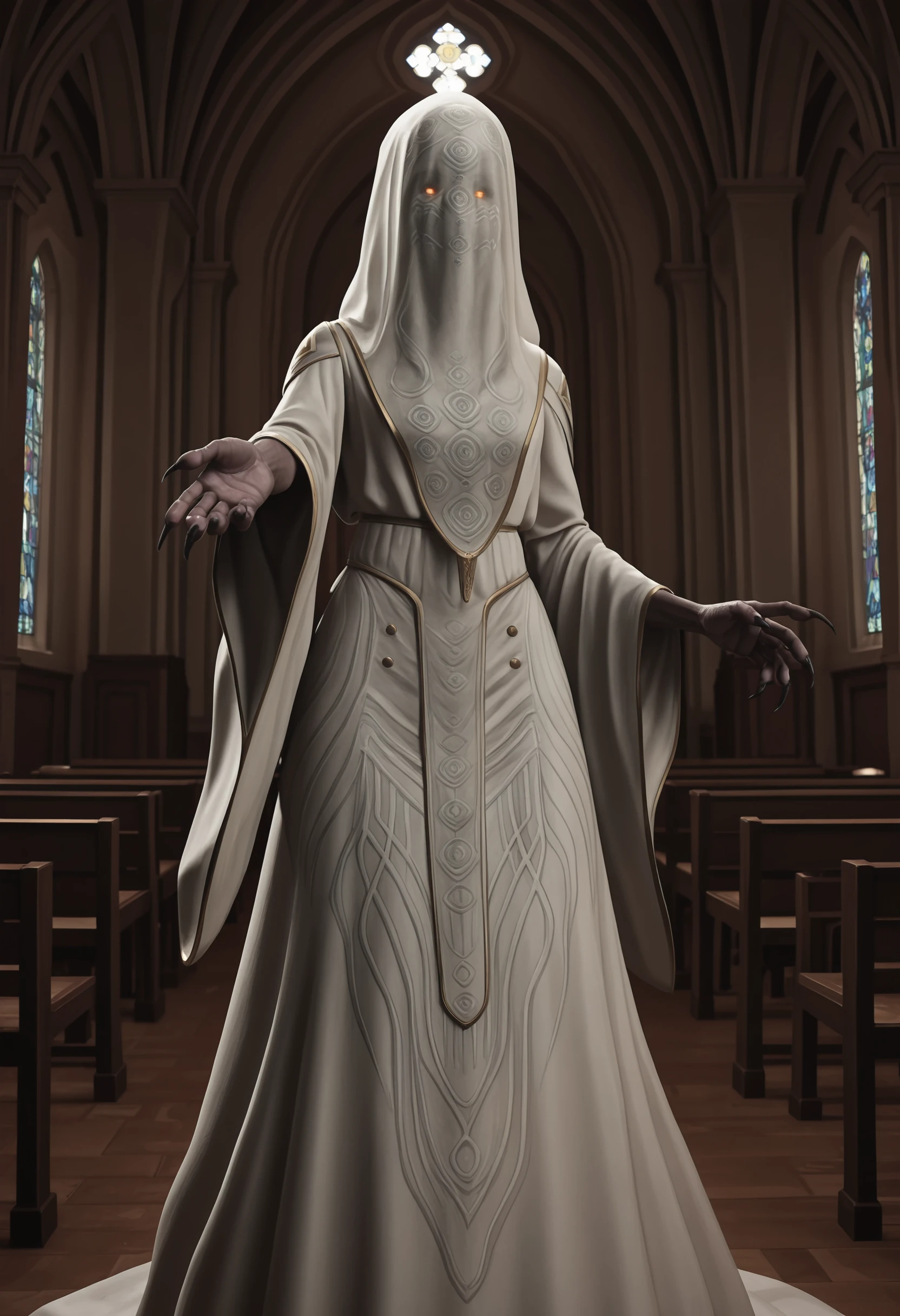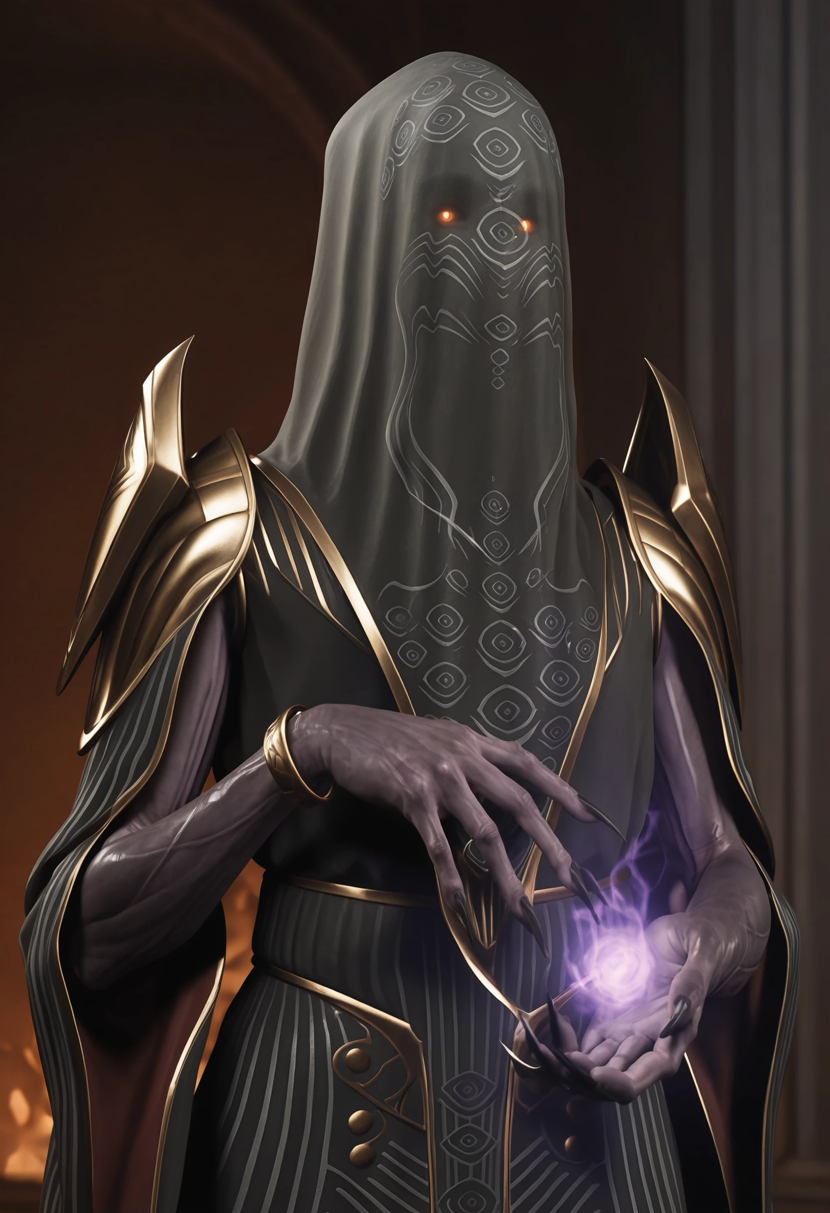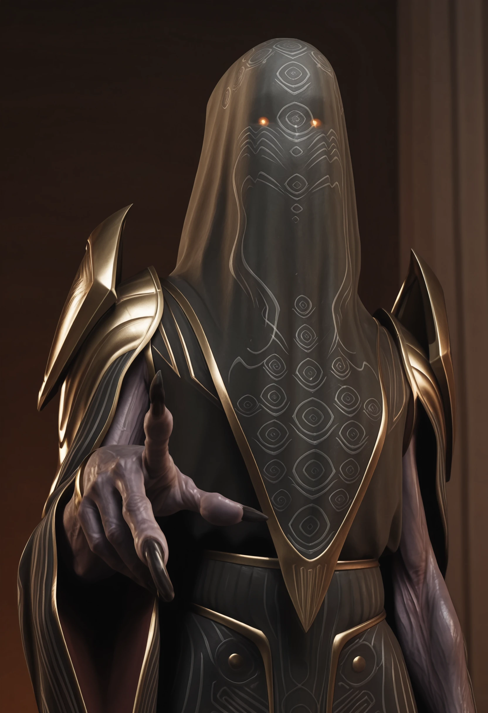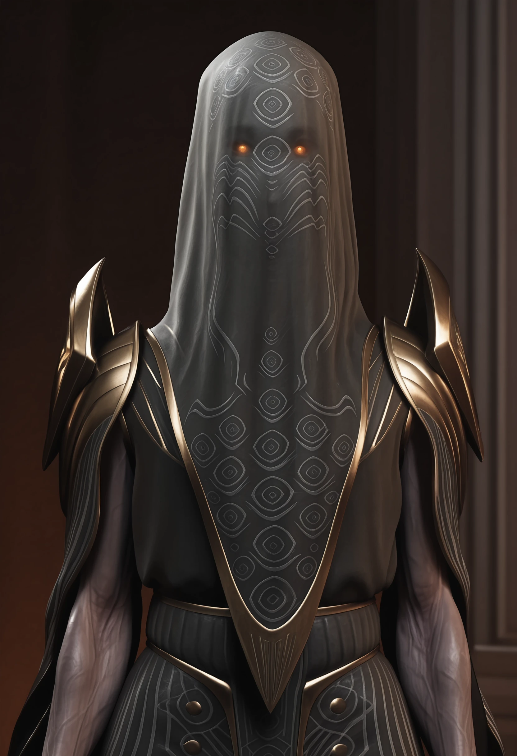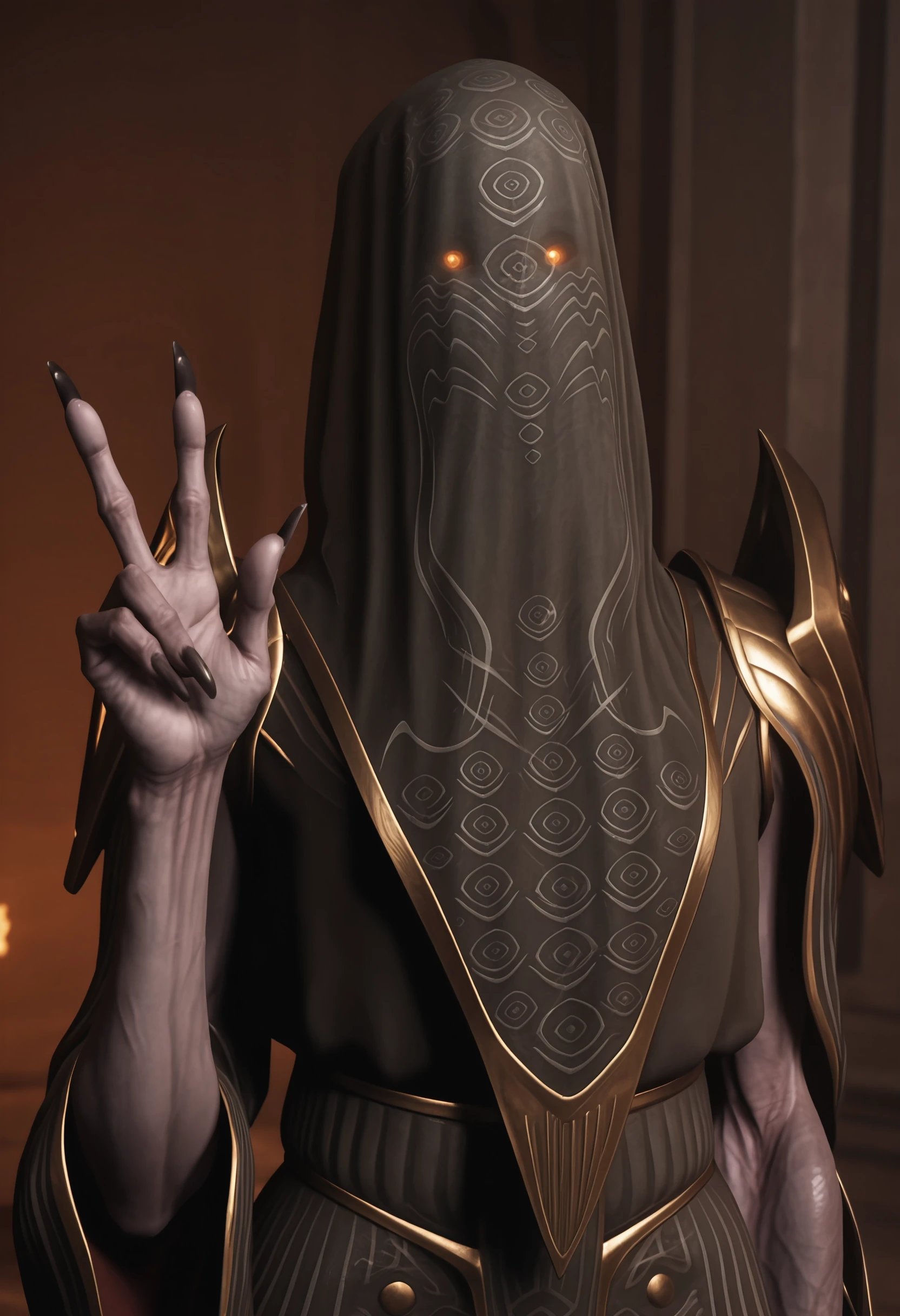 w1tilf, faceless, orange eyes, glowing eyes, claws, robe, shoulder armor, bracelet, veil
