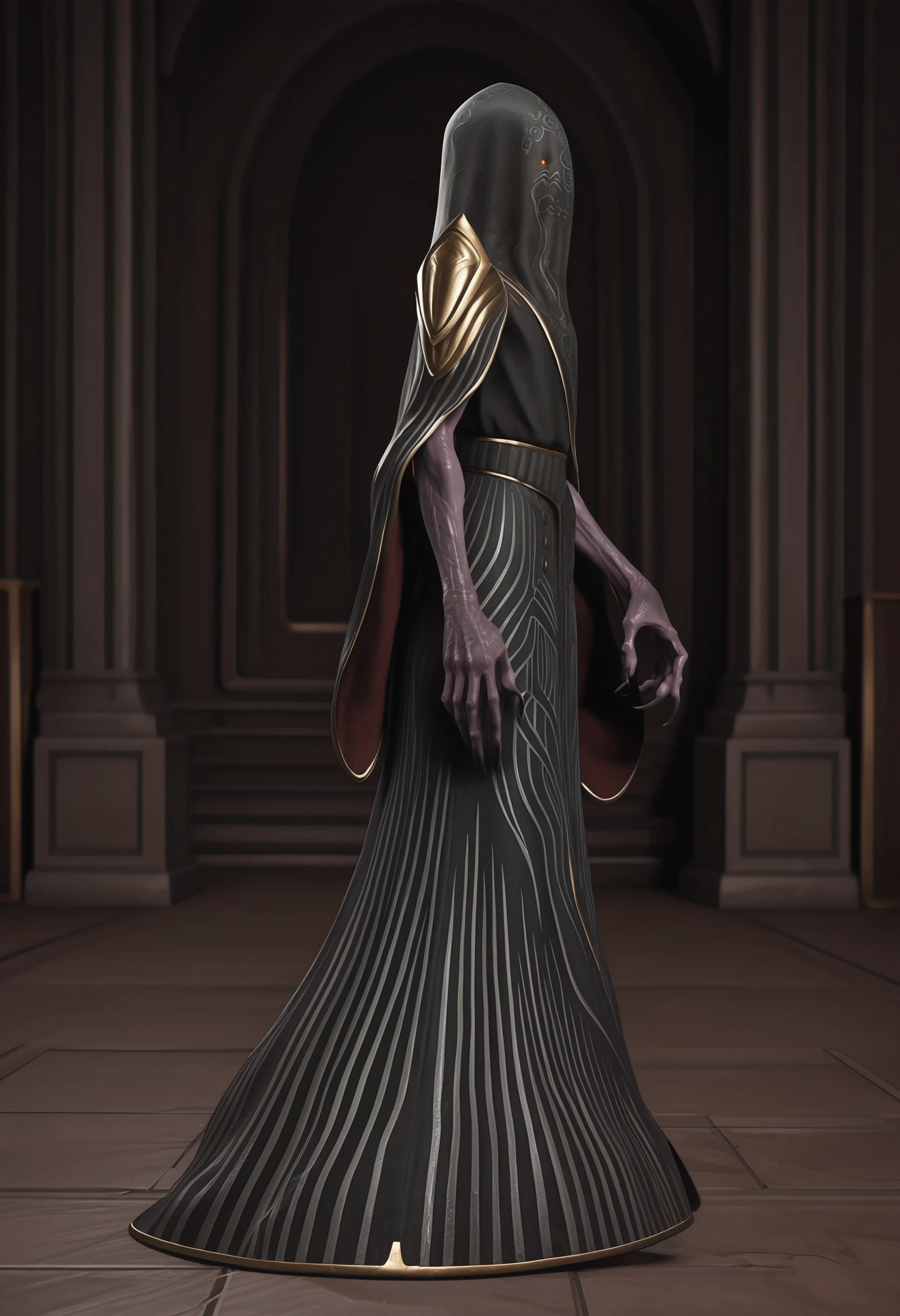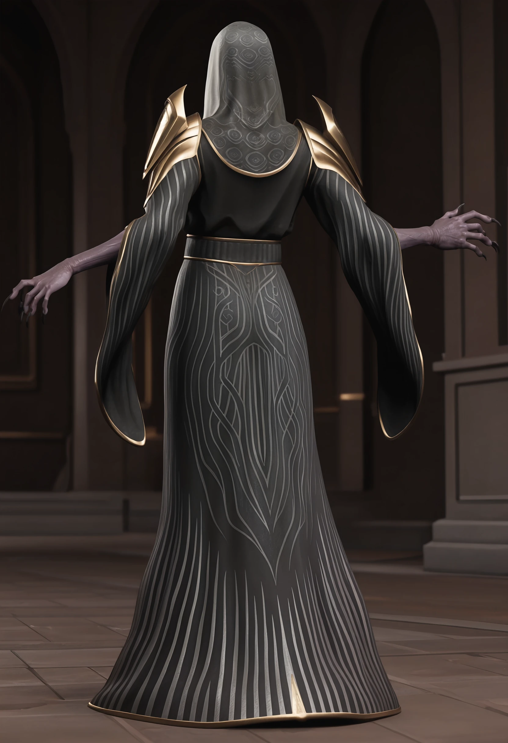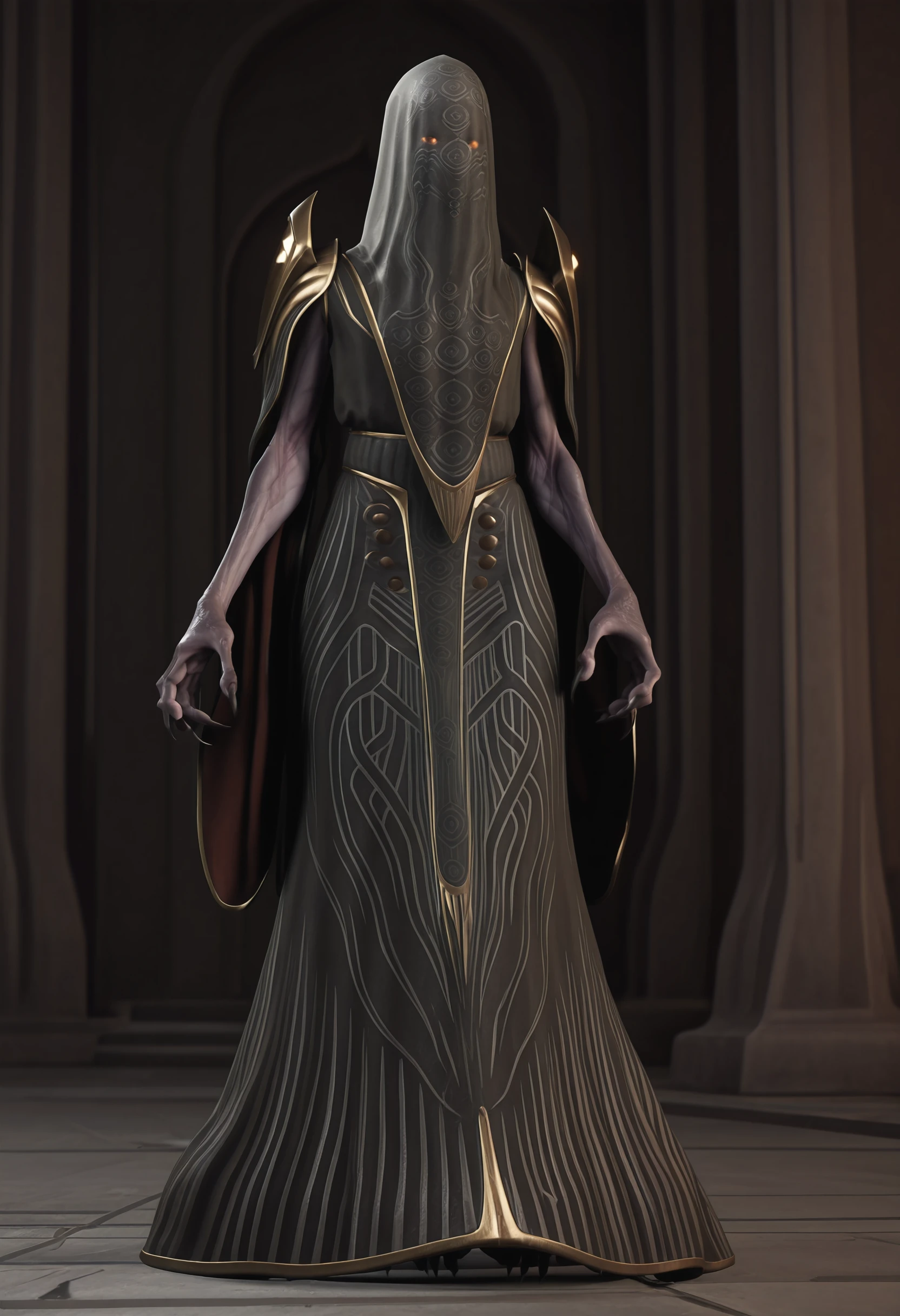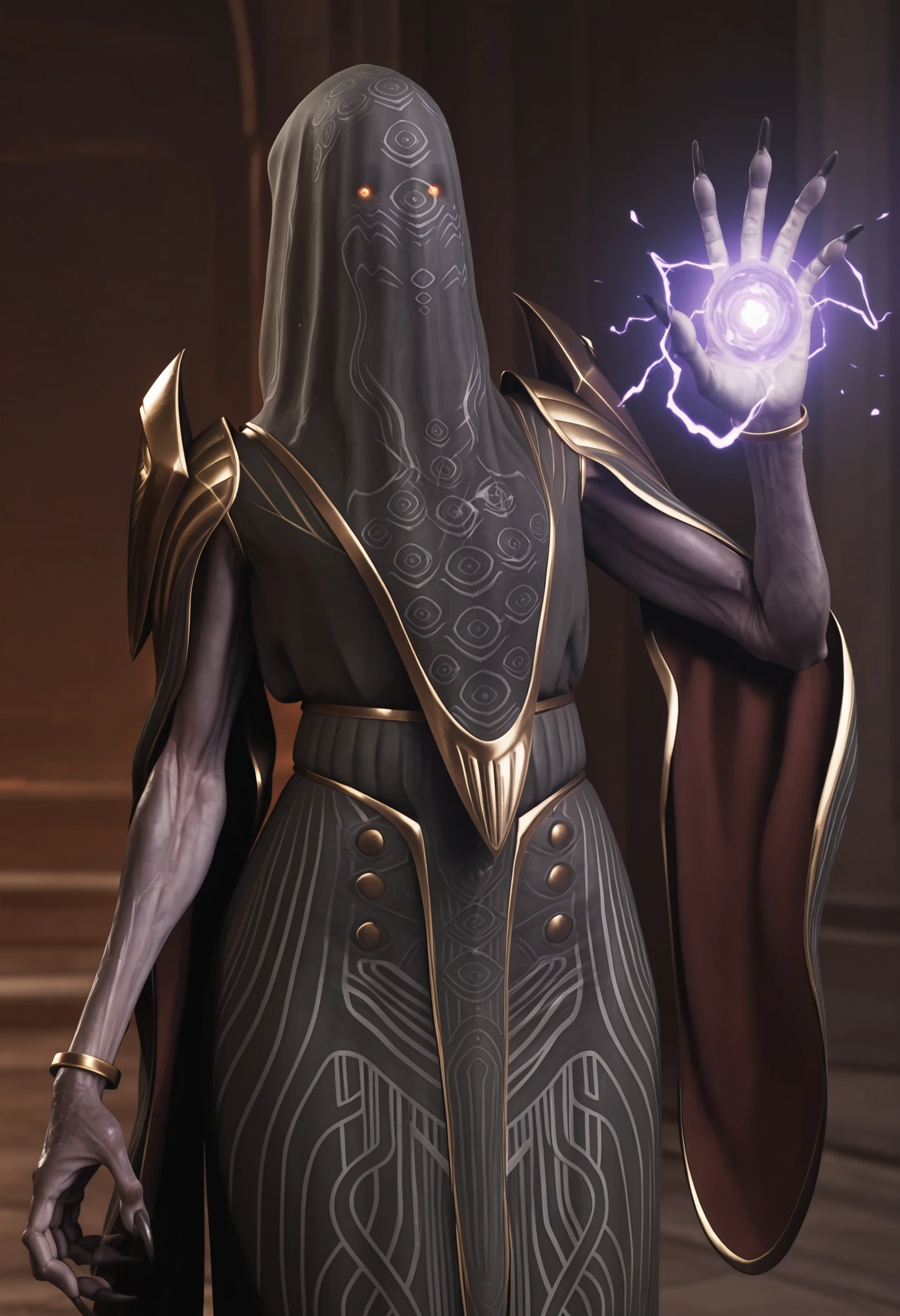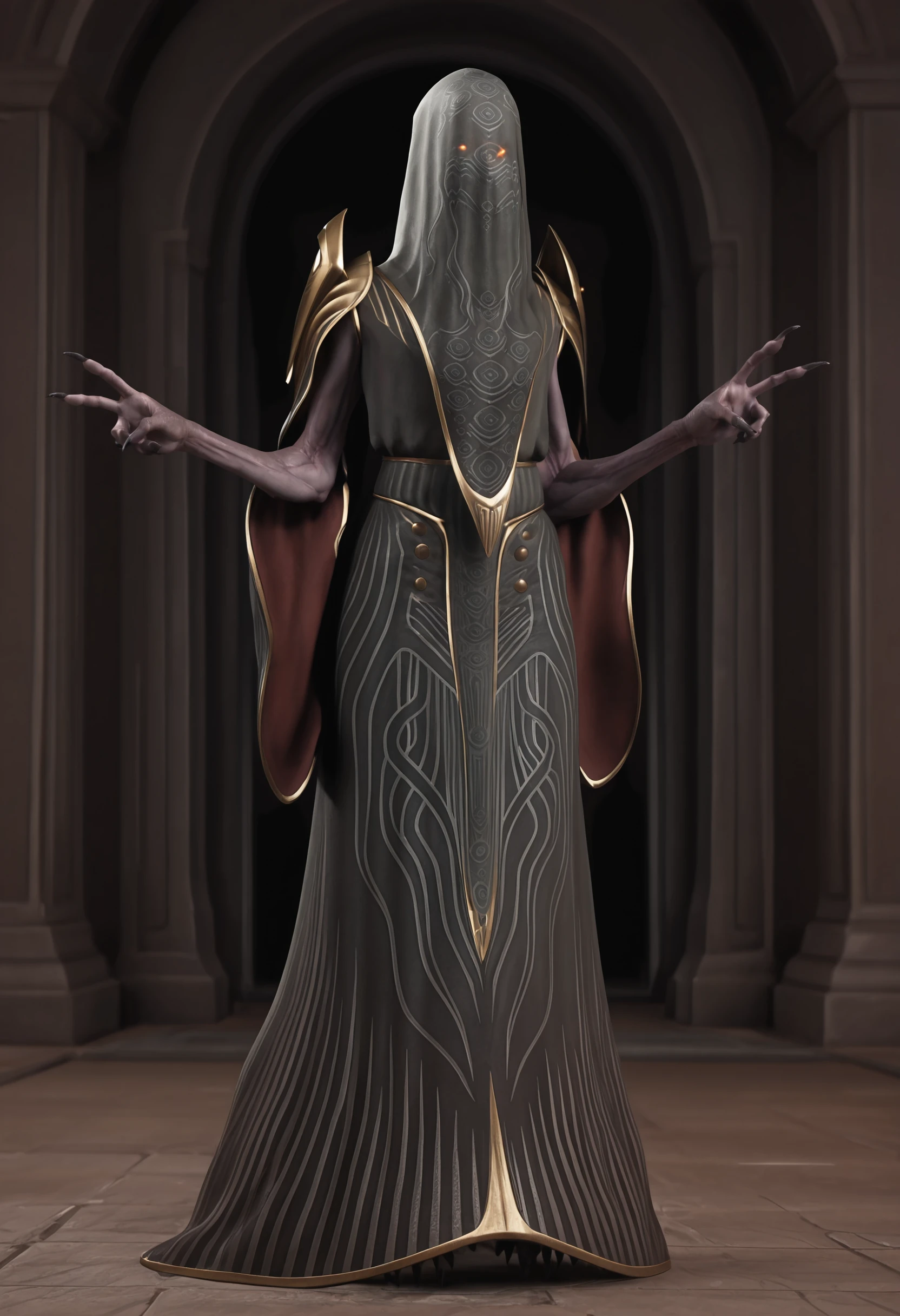 w1tilf, faceless, orange eyes, glowing eyes, claws, robe, shoulder armor, bracelet, veil