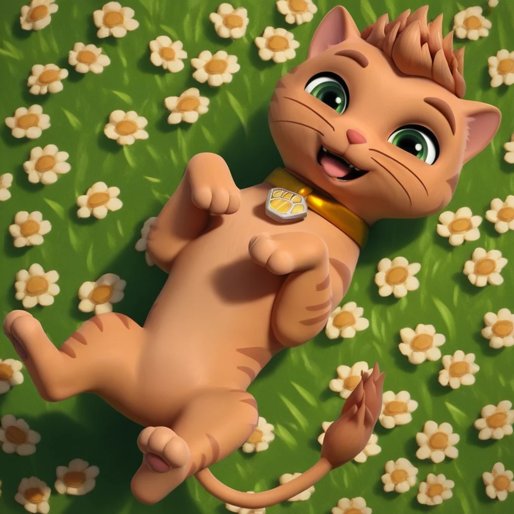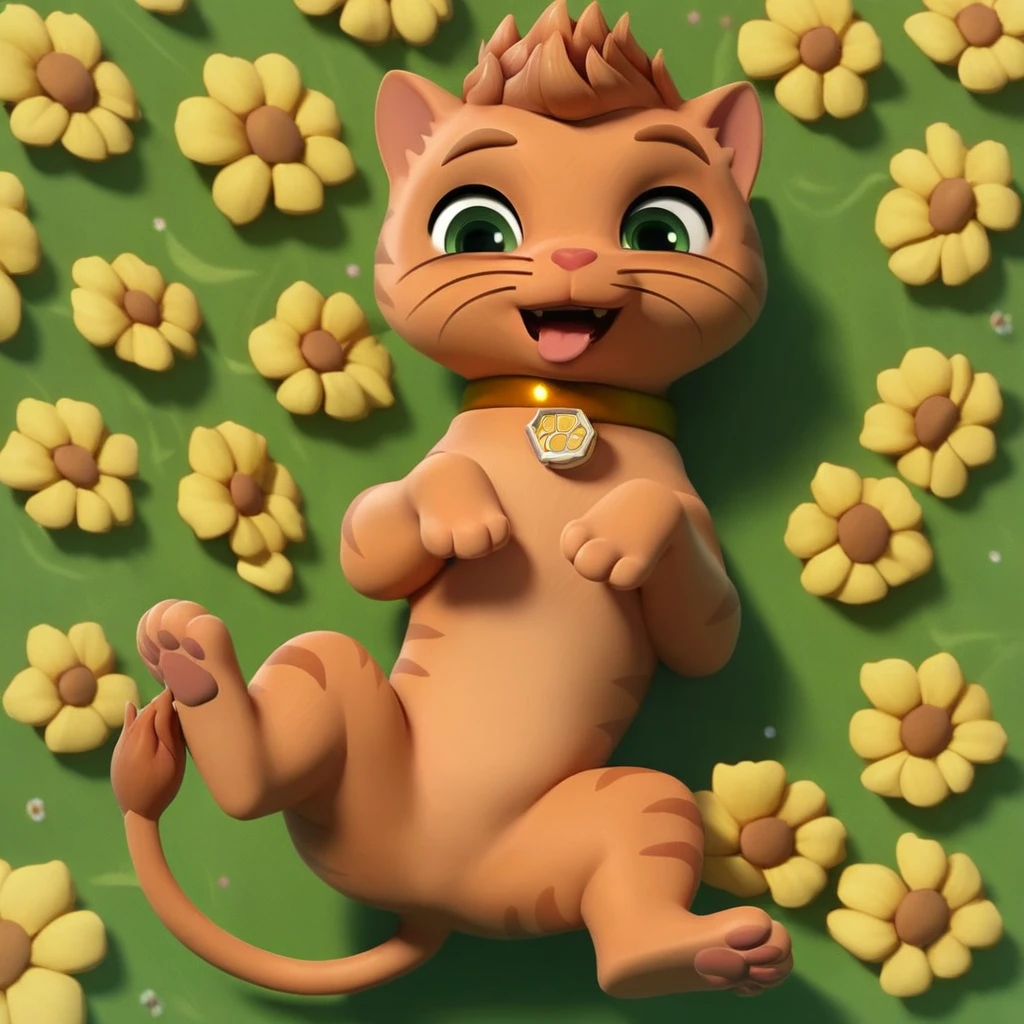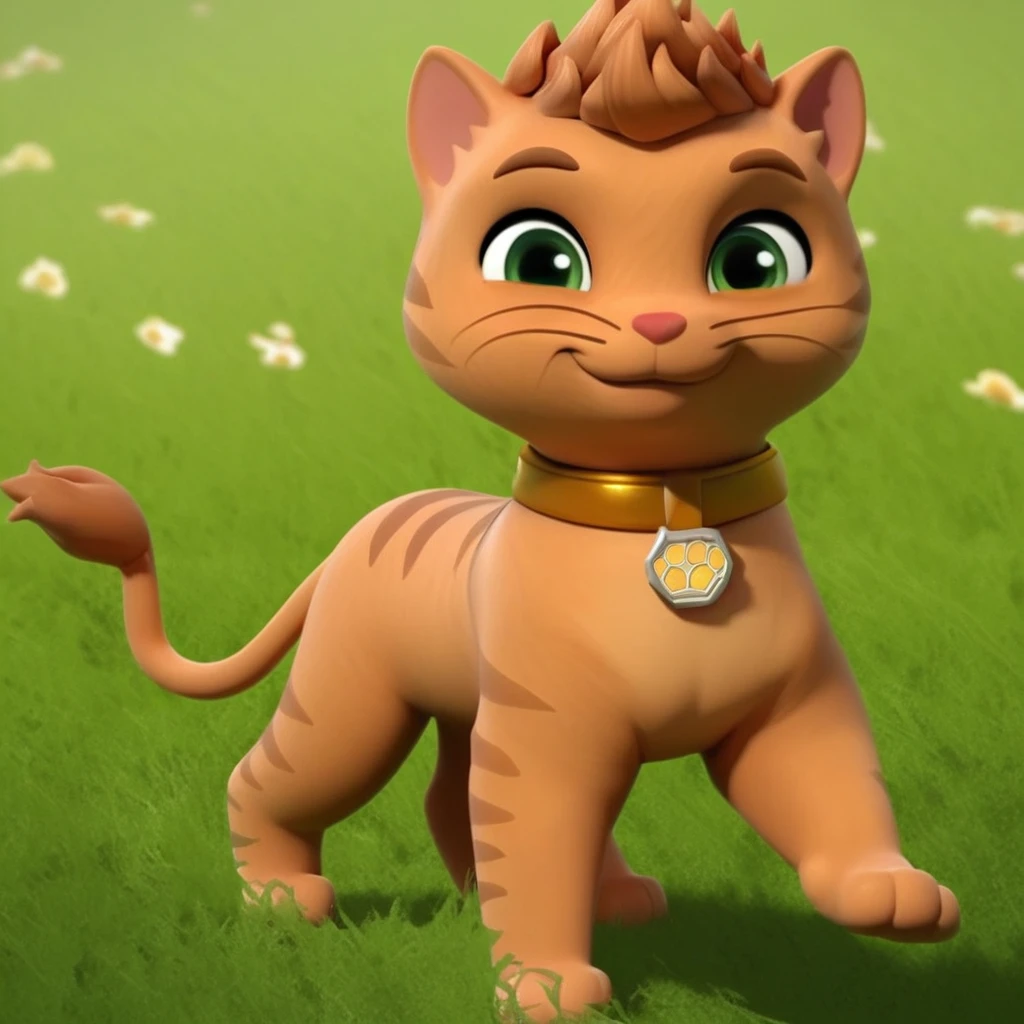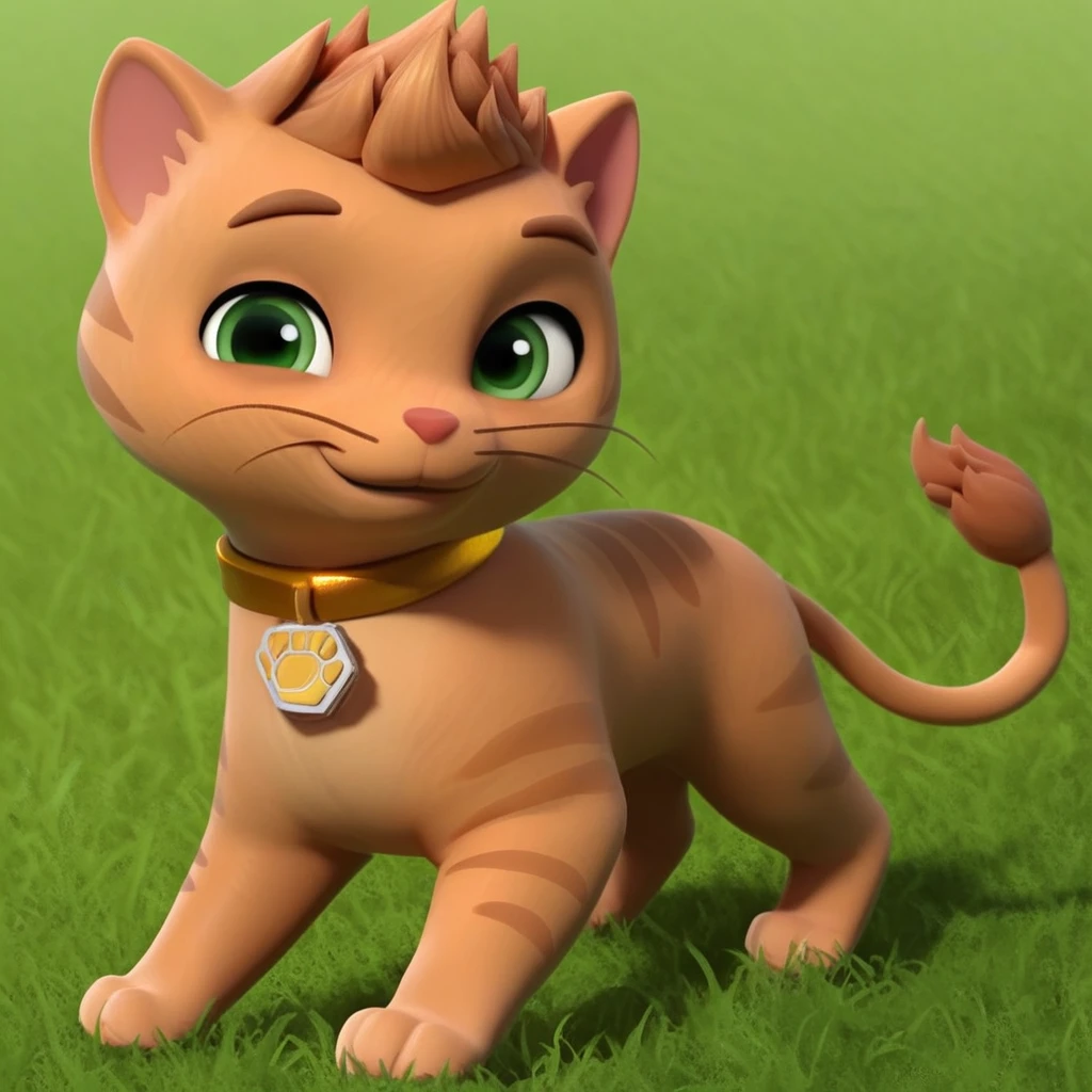 Cat, tabby cat, orange fur, short hair, red nose, lion tail, gold collar, paw print tag,