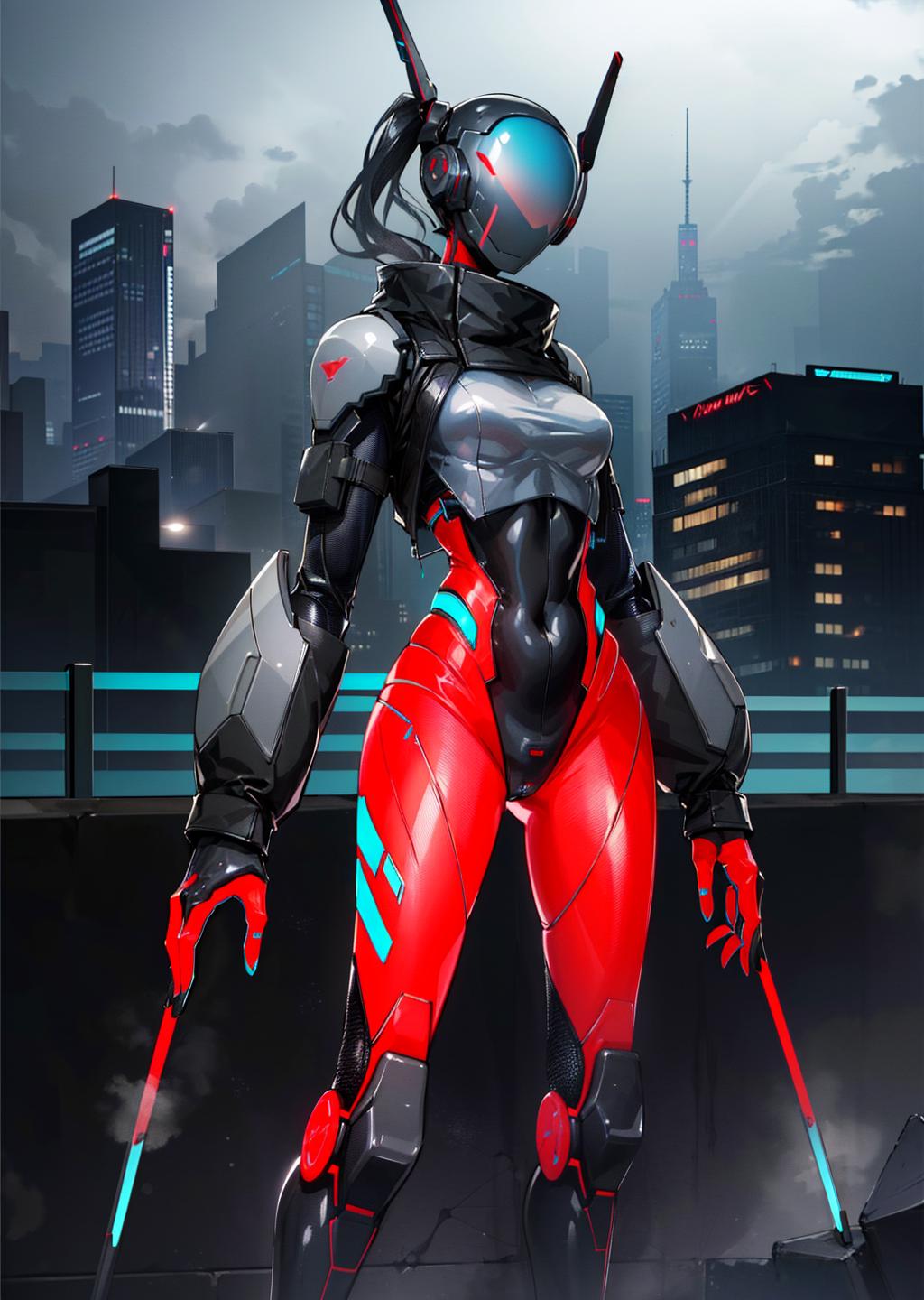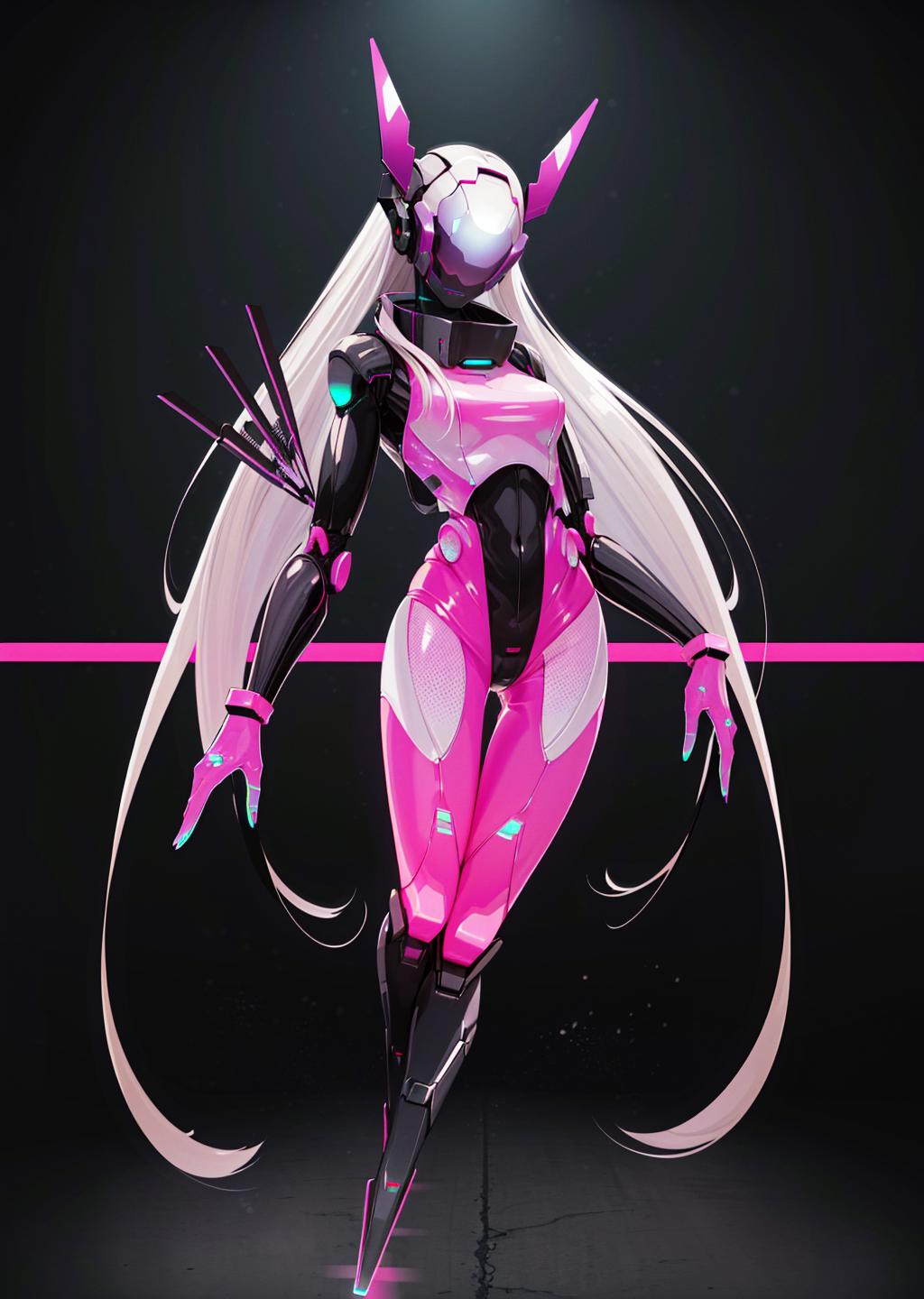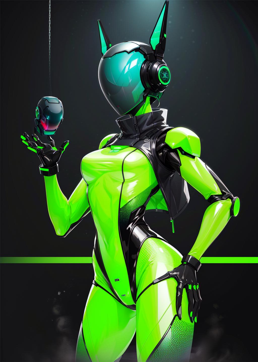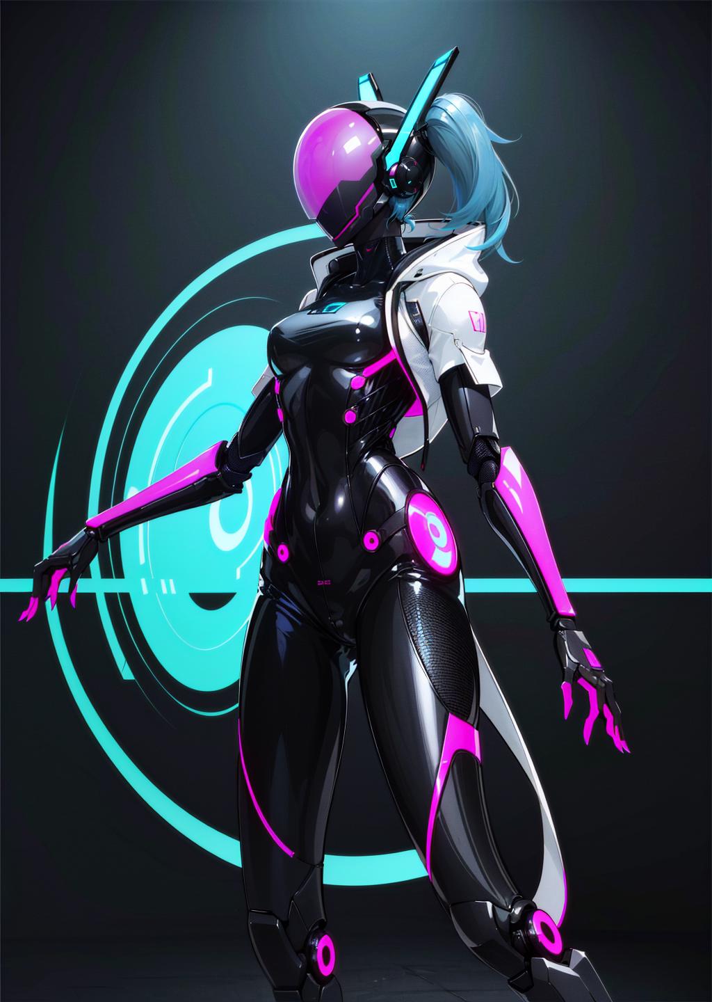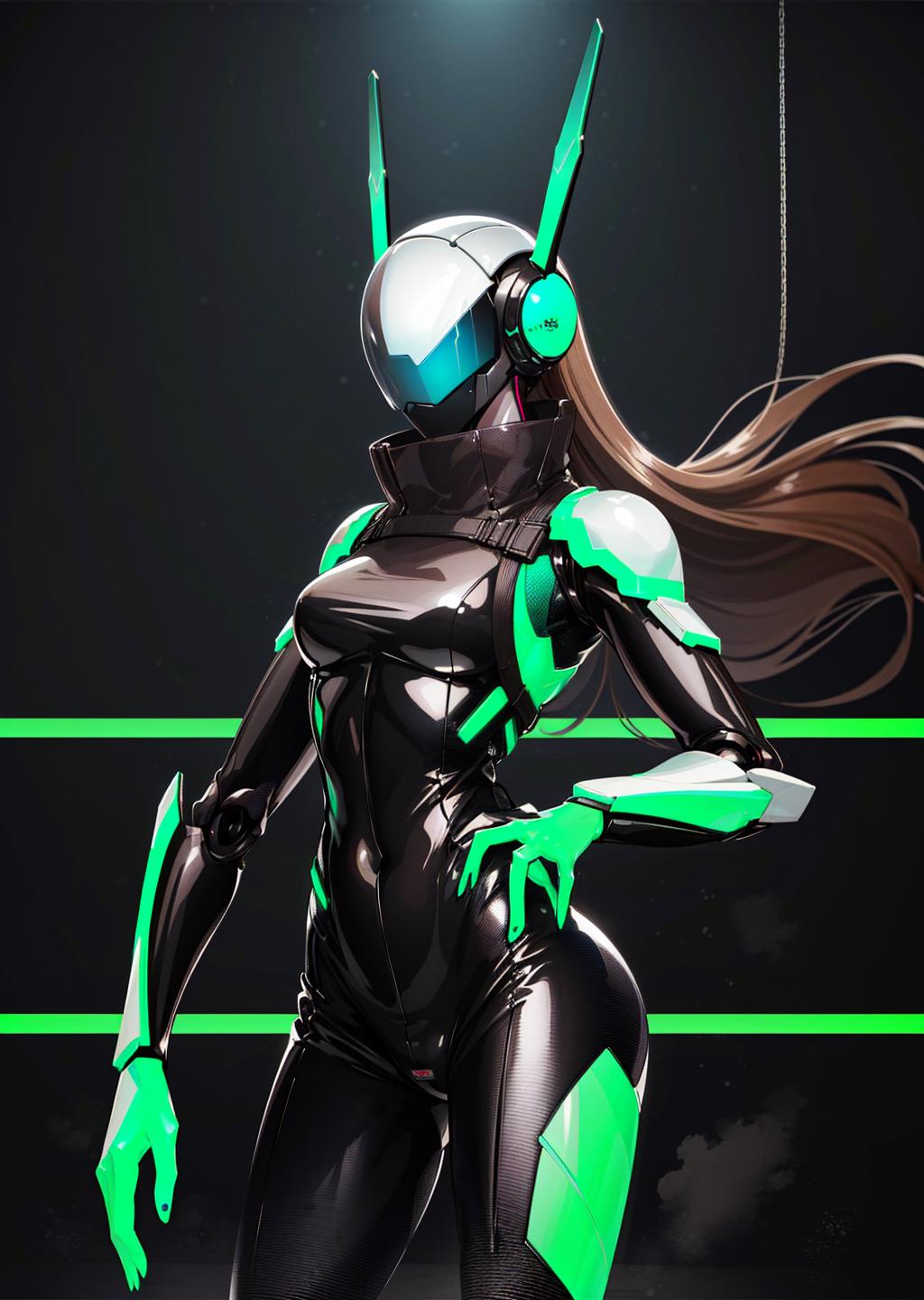 use: science fiction, bodysuit, robot, humanoid robot, helmet, neon trim, shiny clothes, enicha, <lora:enicha:1>