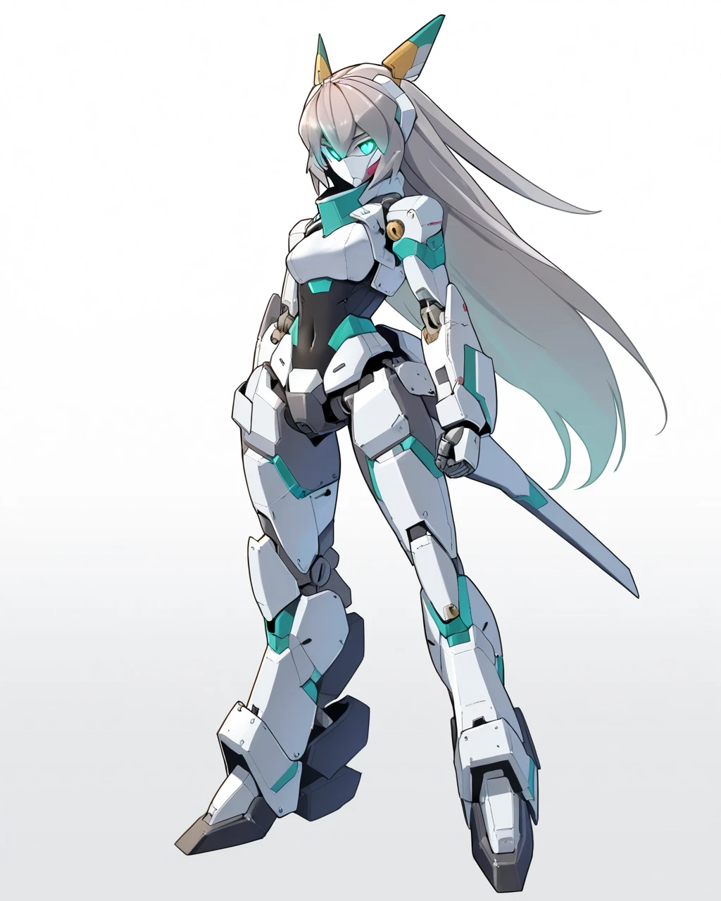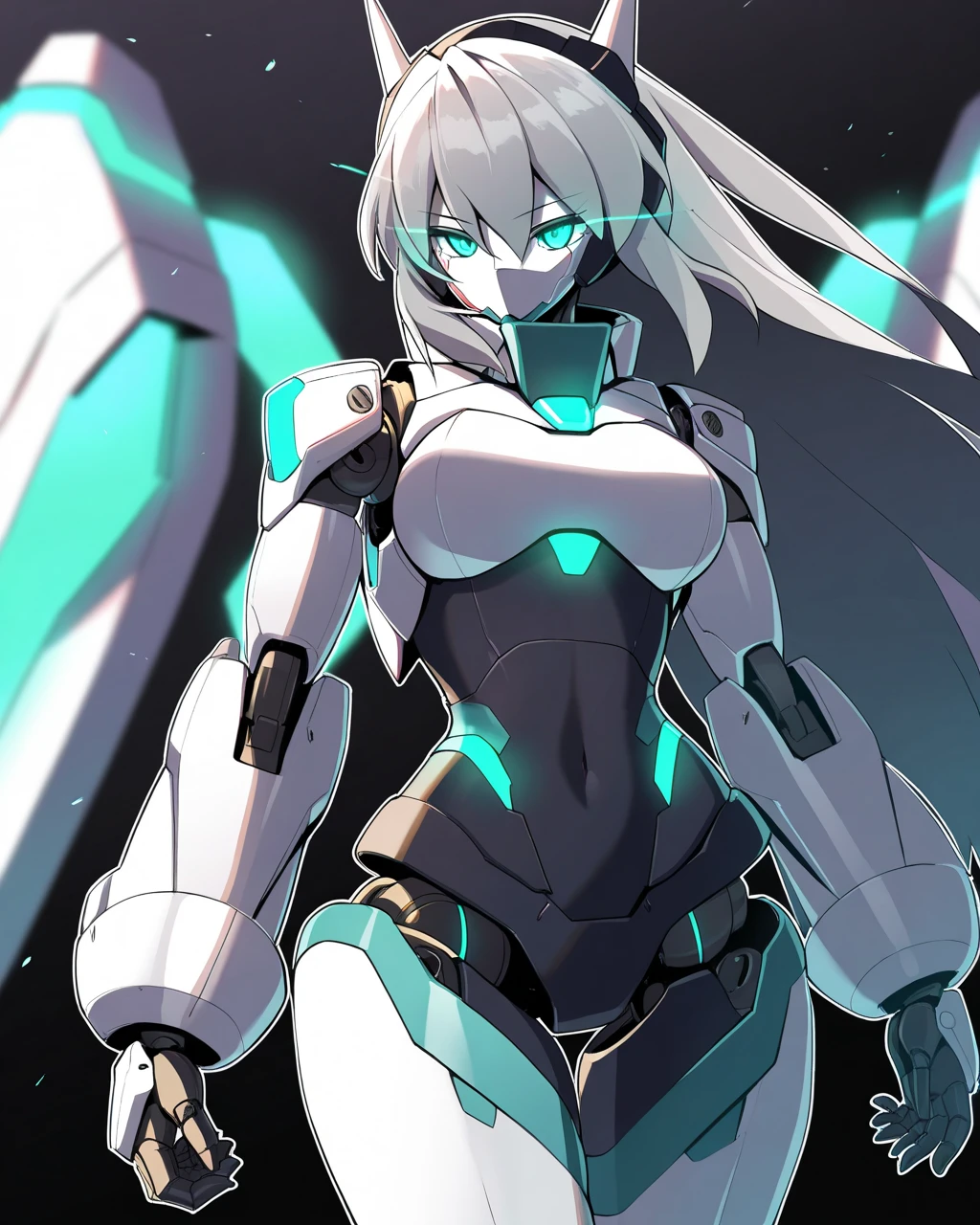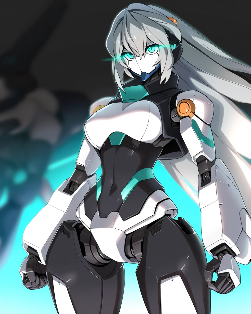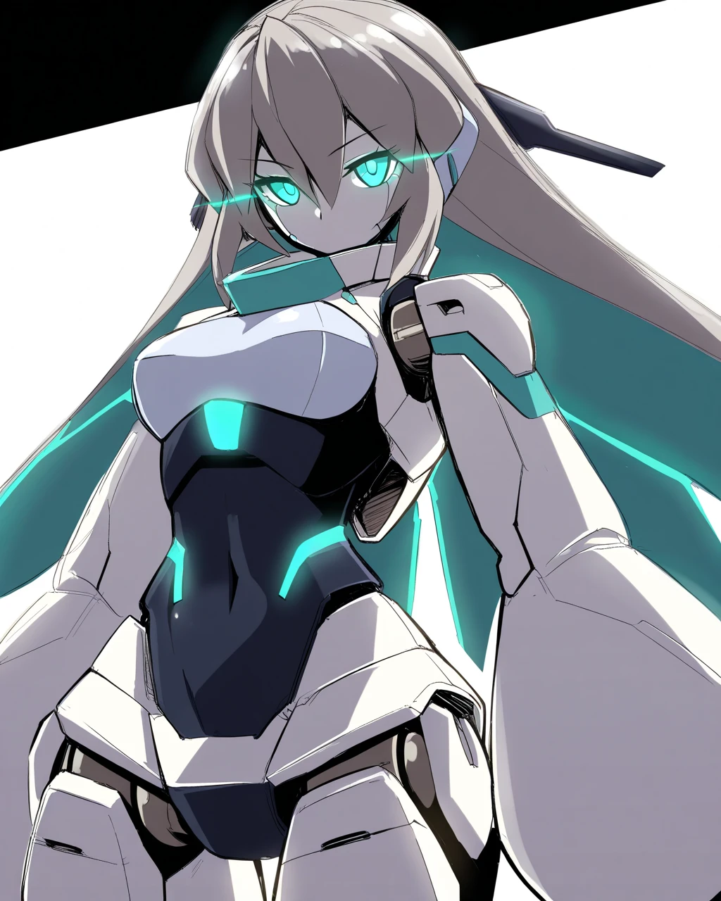 mobile doll may, solo, robot, mecha, no humans,grey hair,glowing eyes,aqua eyes, long hair,covered navel, joints, android,