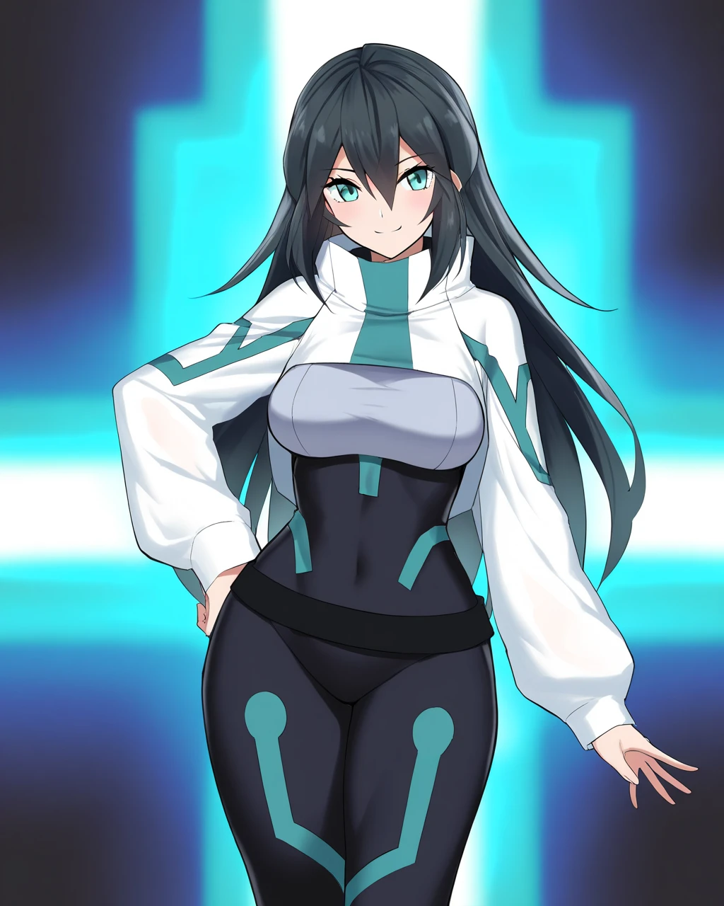 may, 1girl, solo, long hair, aqua eyes, black hair, hair between eyes, black bodysuit,shrug \(clothing\),