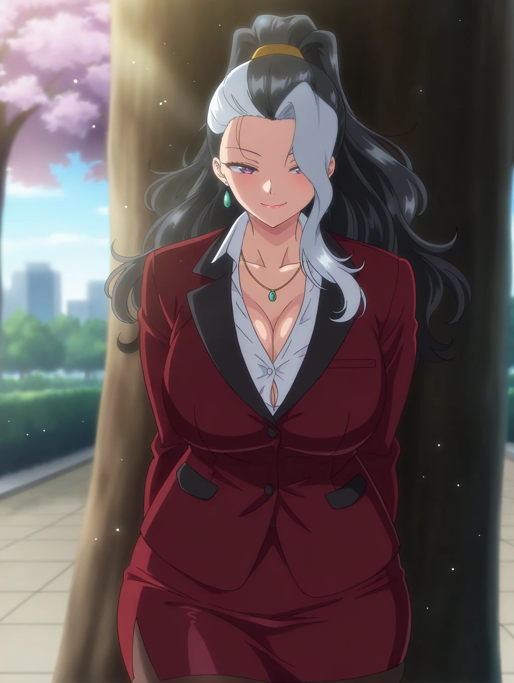 -rikkaponyxl,two-tone hair,multicolored hair,black hair,white hair,high ponytail,purple eyes,eyewear,earrings,necklace, large breasts,rolls,thick thighs,red suit, cleavage, red skirt, black_pantyhose, black buttons