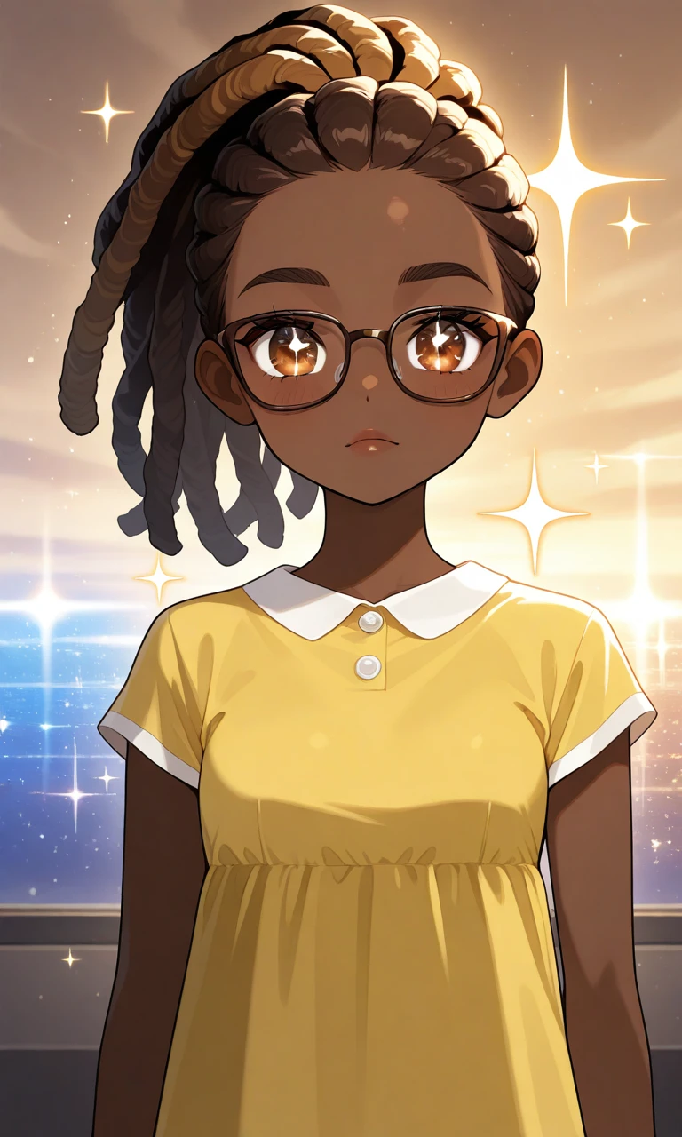 1girl,brown hair,dreadlocks,brown eyes,dark-skinned female,yellow dress,glasses