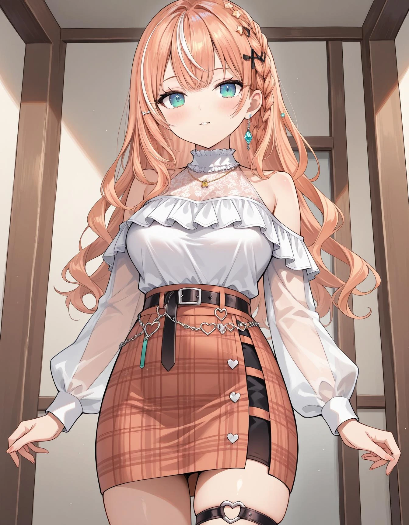 nijirikacos,white shirt,lace halterneck,shoulder cutout,puffy long sleeves,see-through sleeves,black belt,heart chain,brown plaid skirt,pencil skirt,high-waist skirt,frilled skirt,white frills,button,heart-ring thigh strap,single thigh strap,