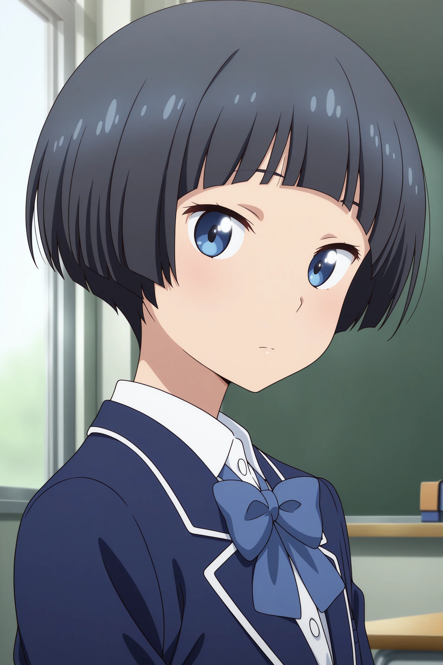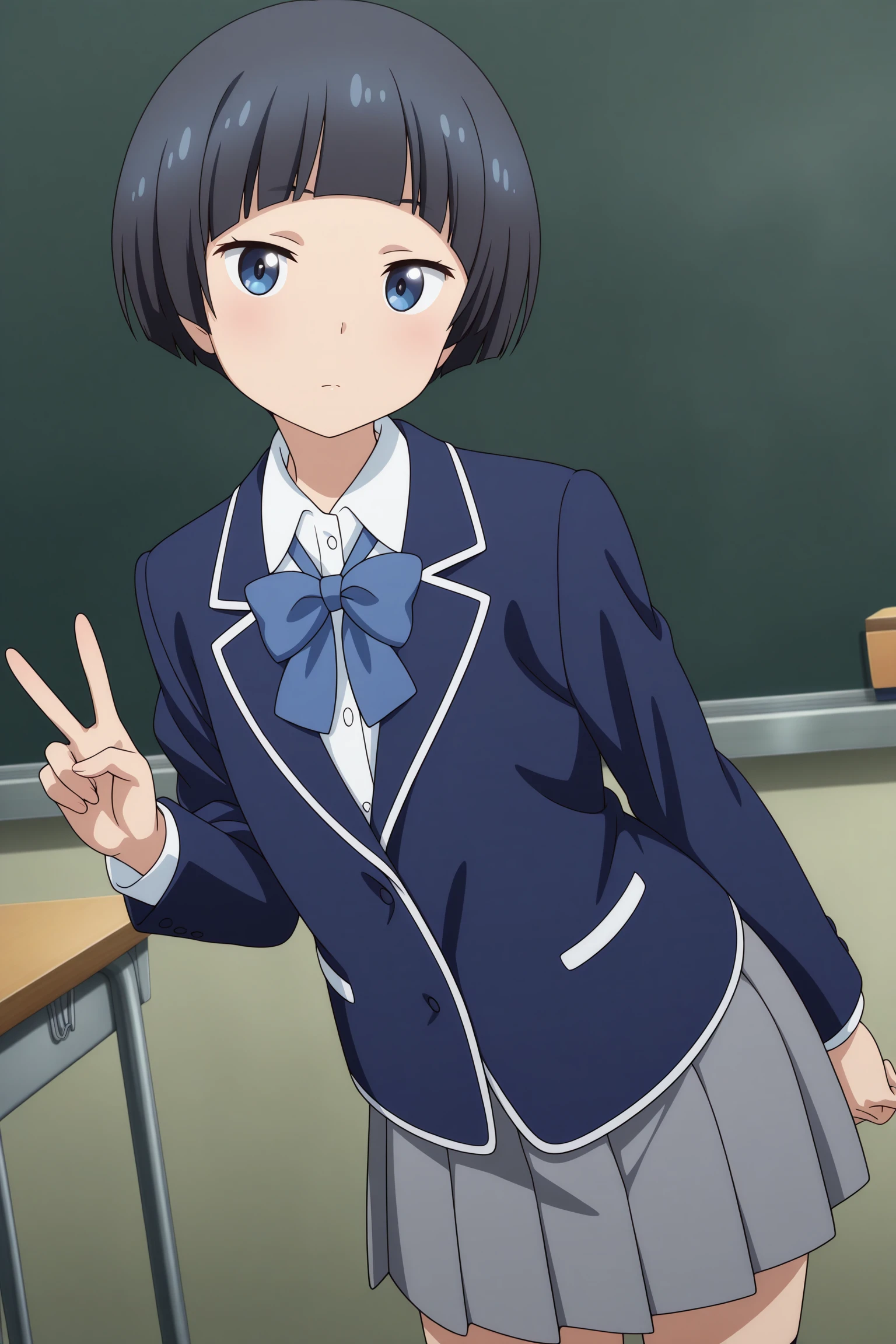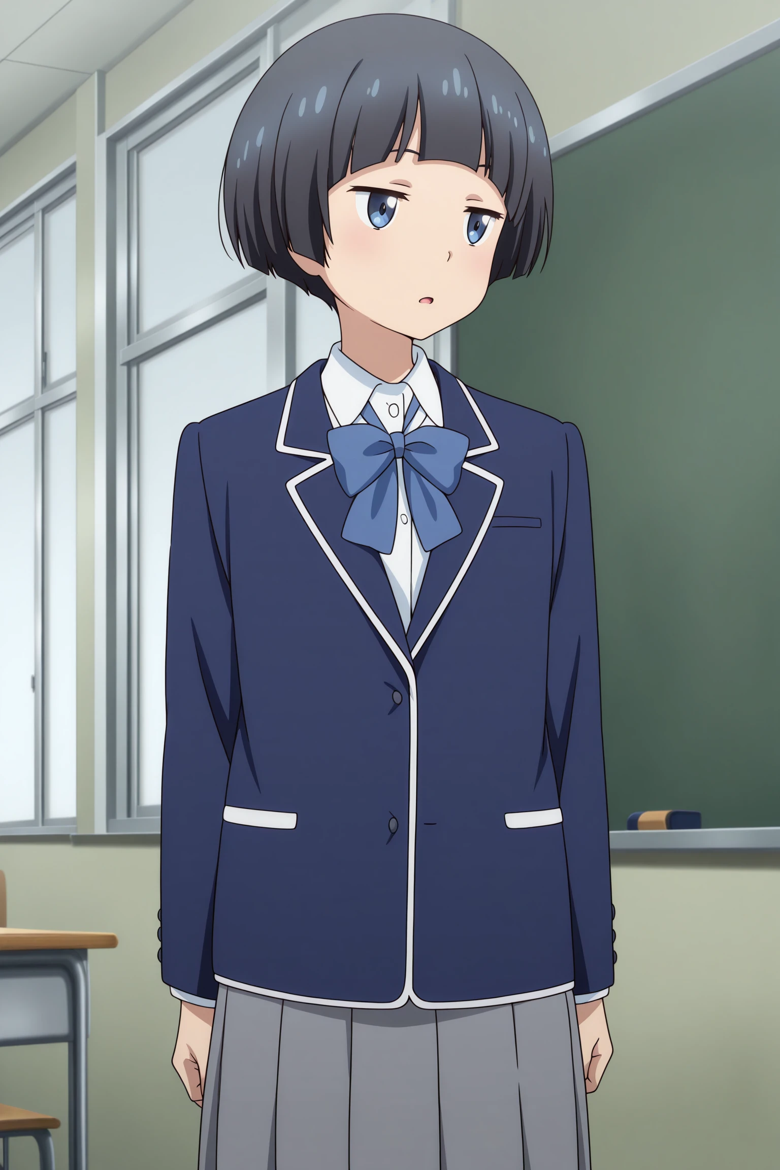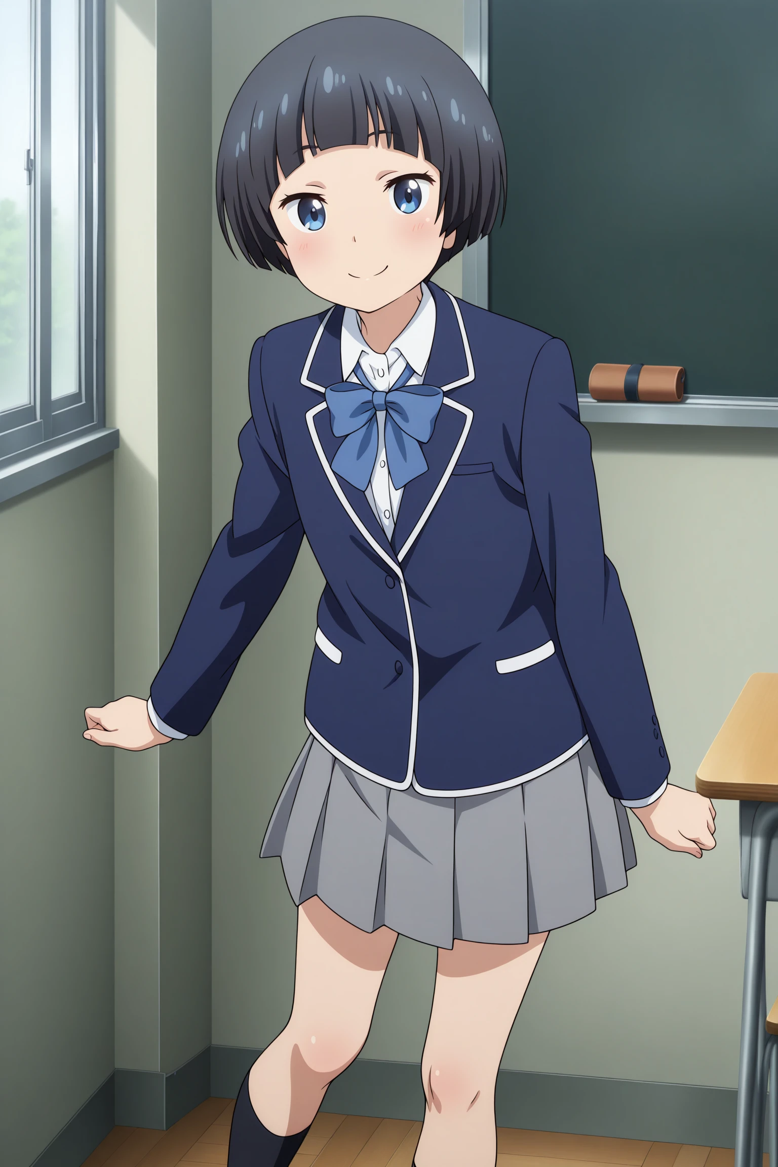 honda sayaka, short hair, black hair, blunt ends, arched bangs, long sleeves, blue jacket, white shirt, collared shirt, blue bowtie, grey skirt, pleated skirt, black socks, kneehighs, uwabaki