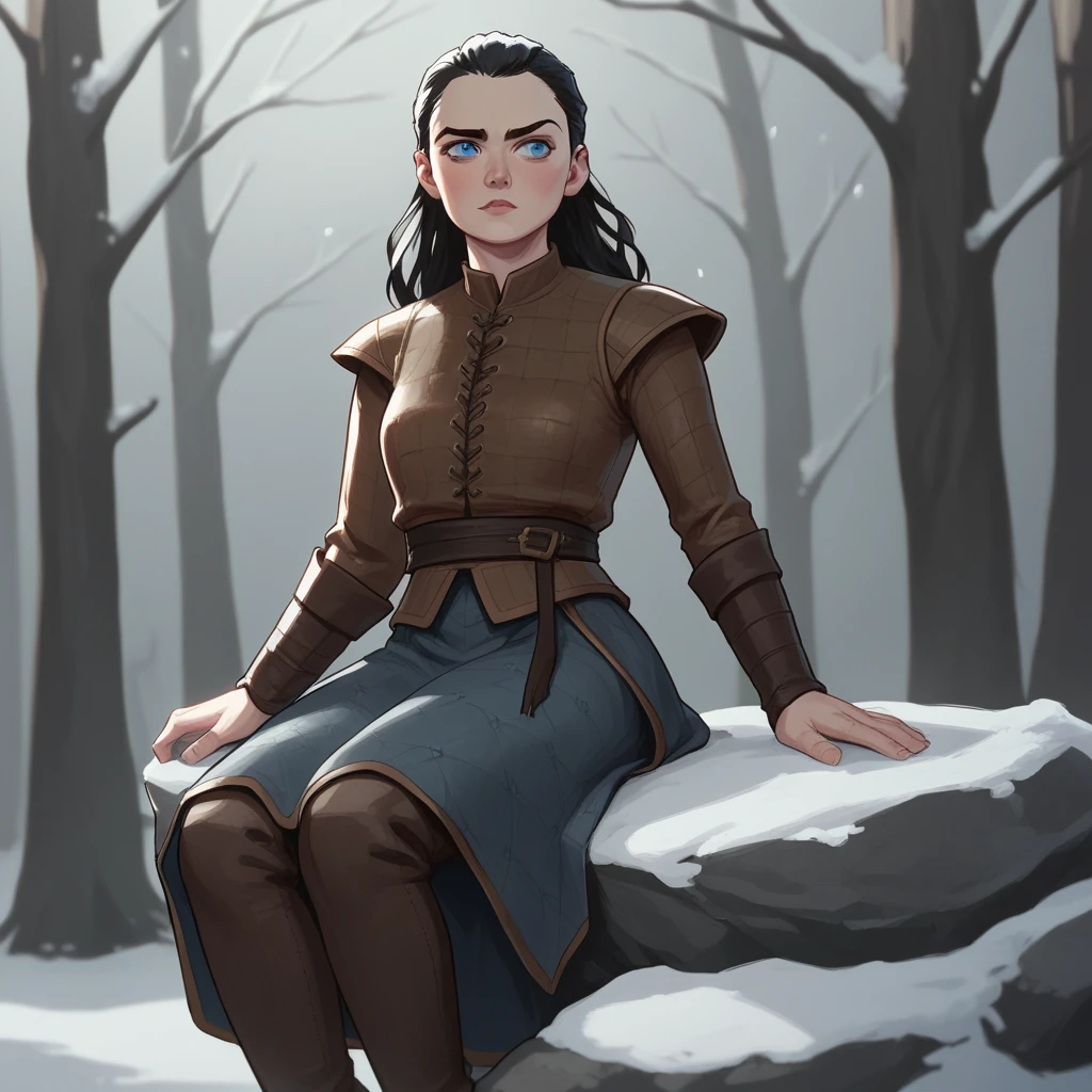 AryaStark, 1girl, solo, black hair, long hair, blue eyes,