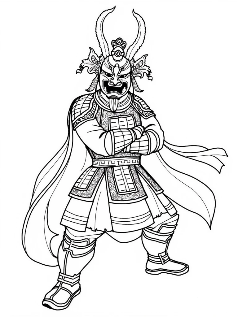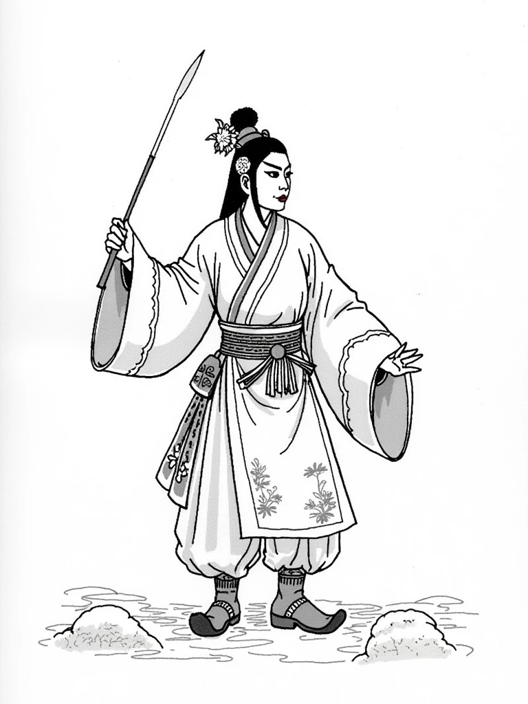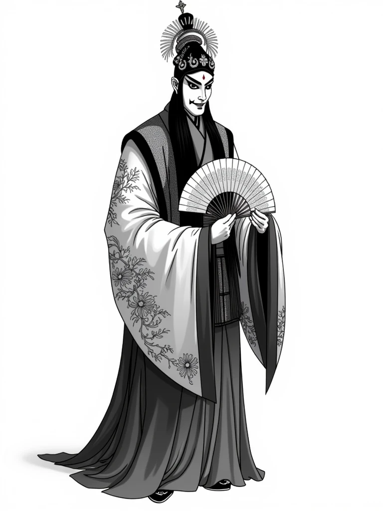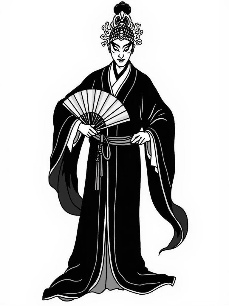 A black and white line art model in the style of a Traditional Chinese theater character.