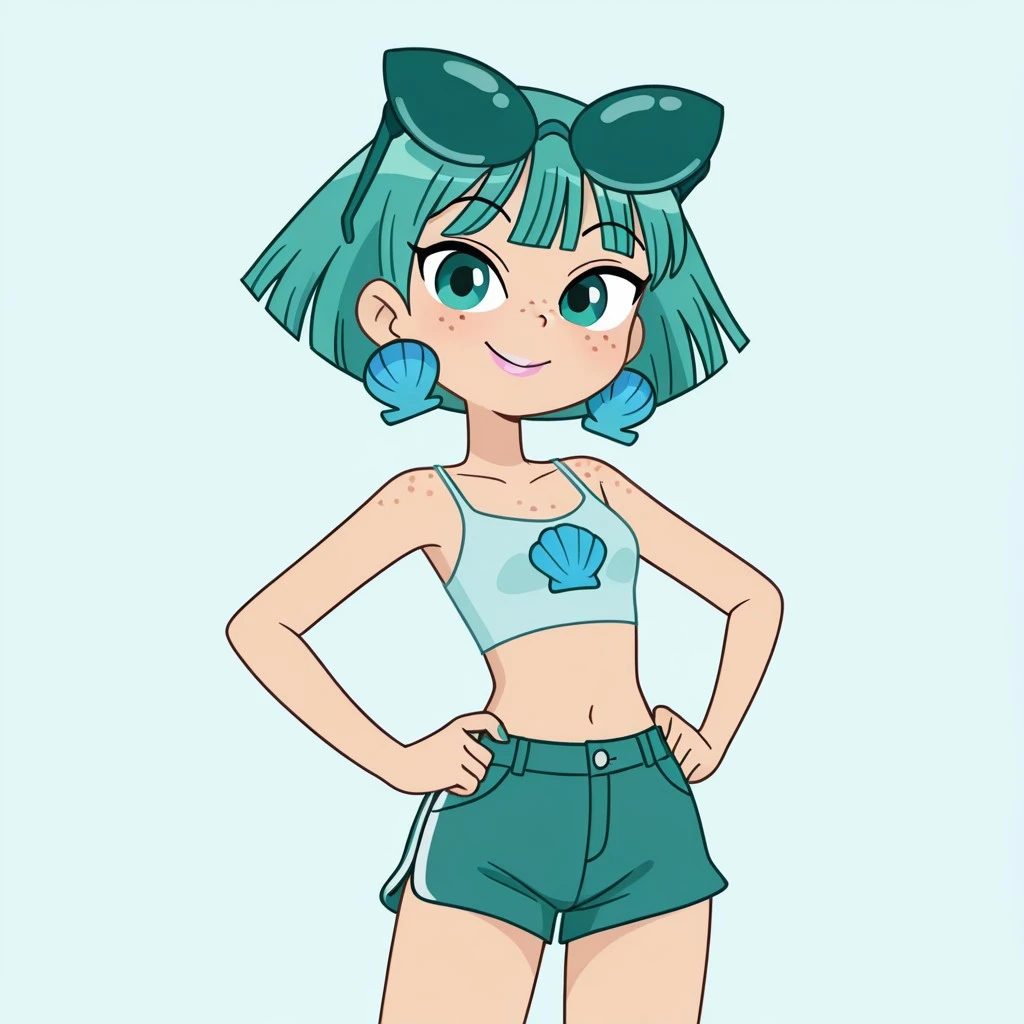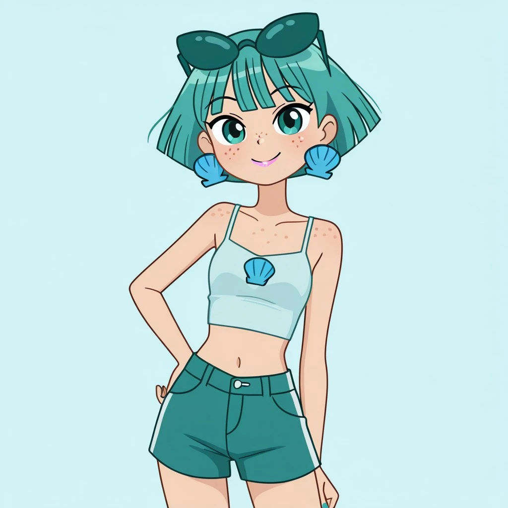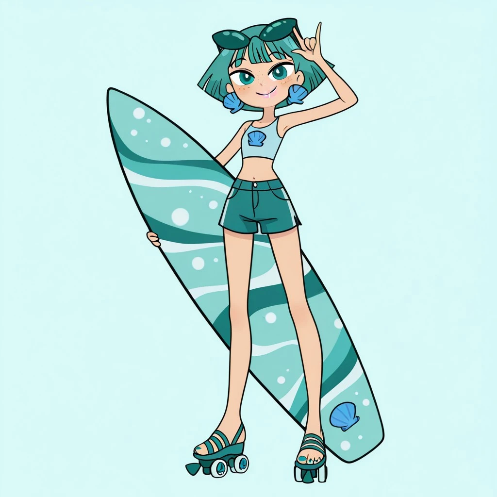 neptunemwatgg, 1girl, solo, freckles, aqua hair, short hair, aqua eyes, light pink lipstick, shell earrings, light blue crop top, aqua shorts, blue toenail polish, open toed shoes, aqua roller skates, aqua sunglasses