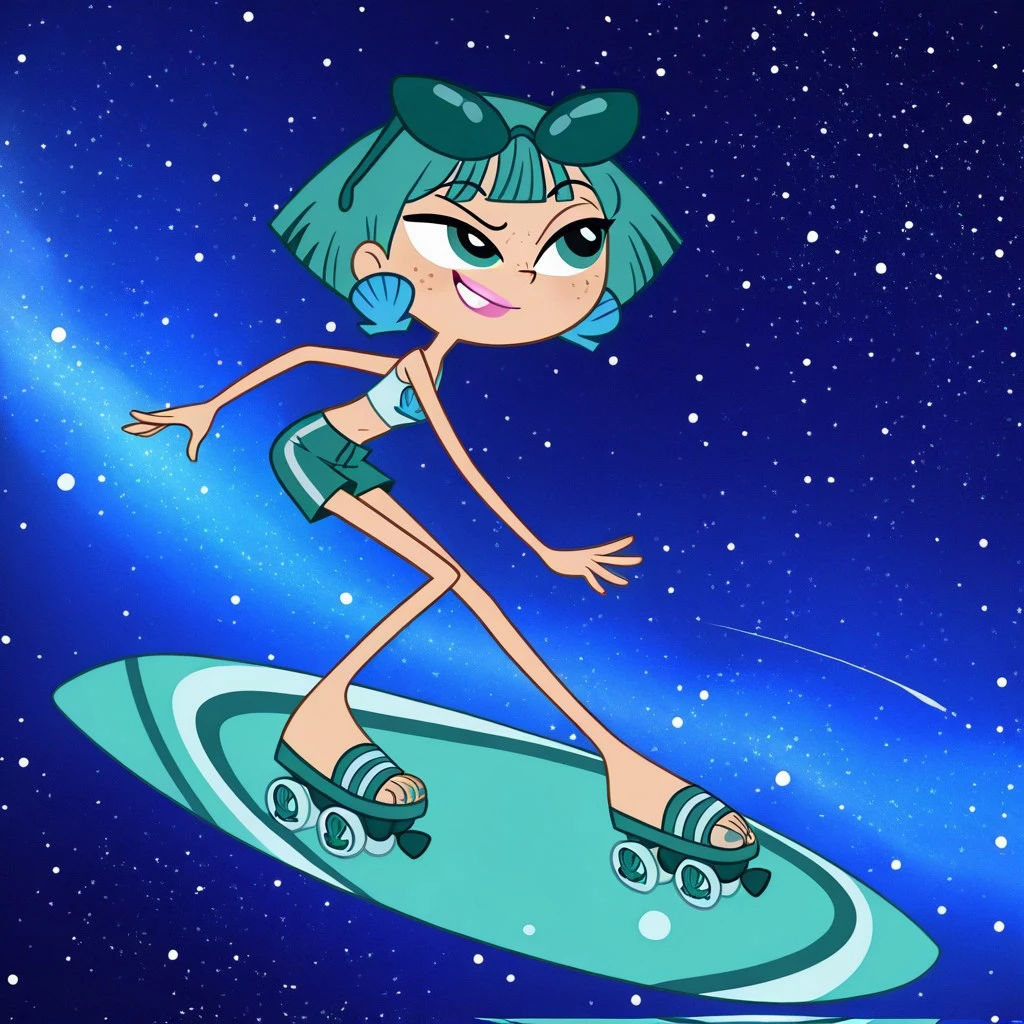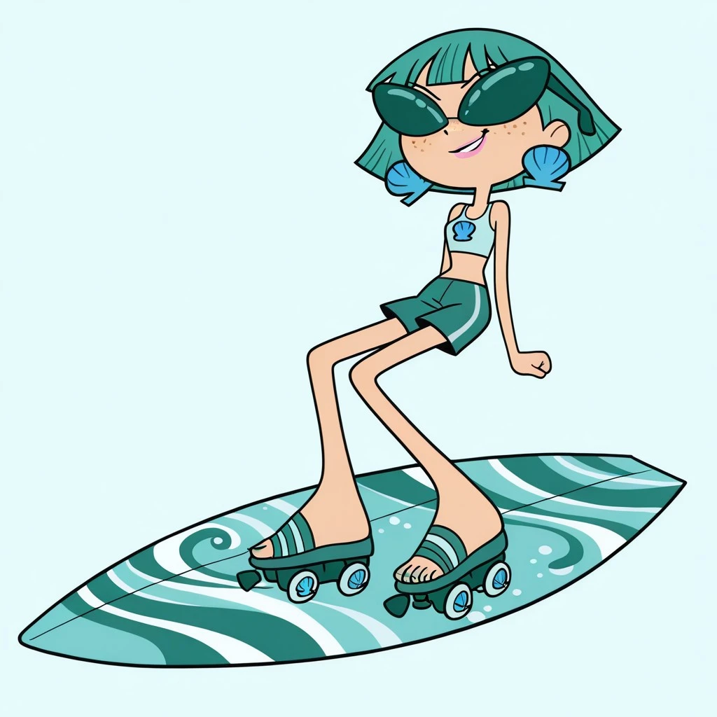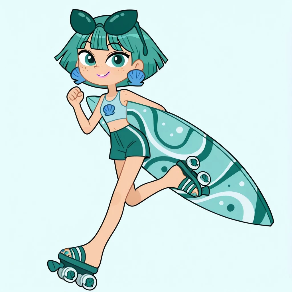 neptunemwatgg, 1girl, solo, freckles, aqua hair, short hair, aqua eyes, light pink lipstick, shell earrings, light blue crop top, aqua shorts, blue toenail polish, open toed shoes, aqua roller skates, aqua sunglasses