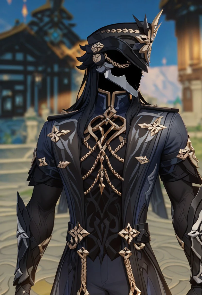 black hair, long hair , chair, hat, helmet , detailed picture, stocky build,