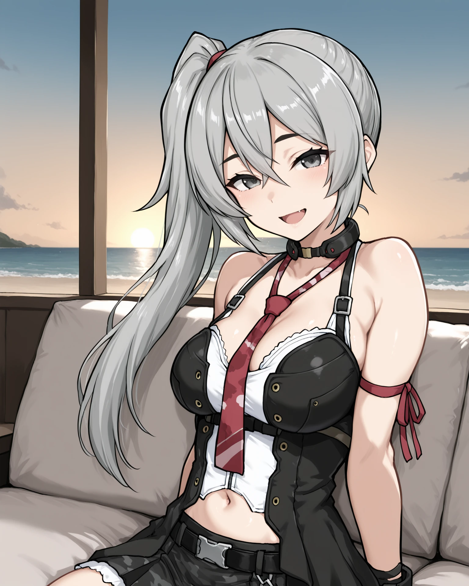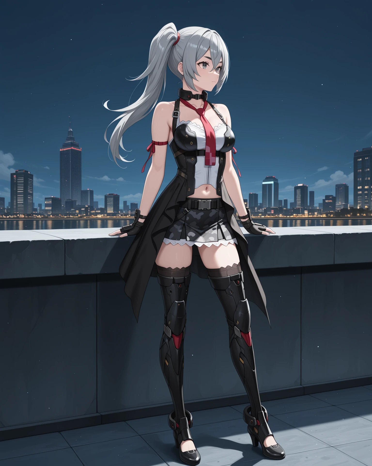 pso2sarah, grey eyes, grey hair, hair between eyes, side ponytail, long hair, thick eyebrows, bare shoulders, black choker, red necktie, medium breasts, black dress, halterneck, white frills, sleeveless, red ribbon, arm ribbon, navel, midriff, black gloves, fingerless gloves, belt, black skirt, urban camouflage, black thighhighs, armored boots