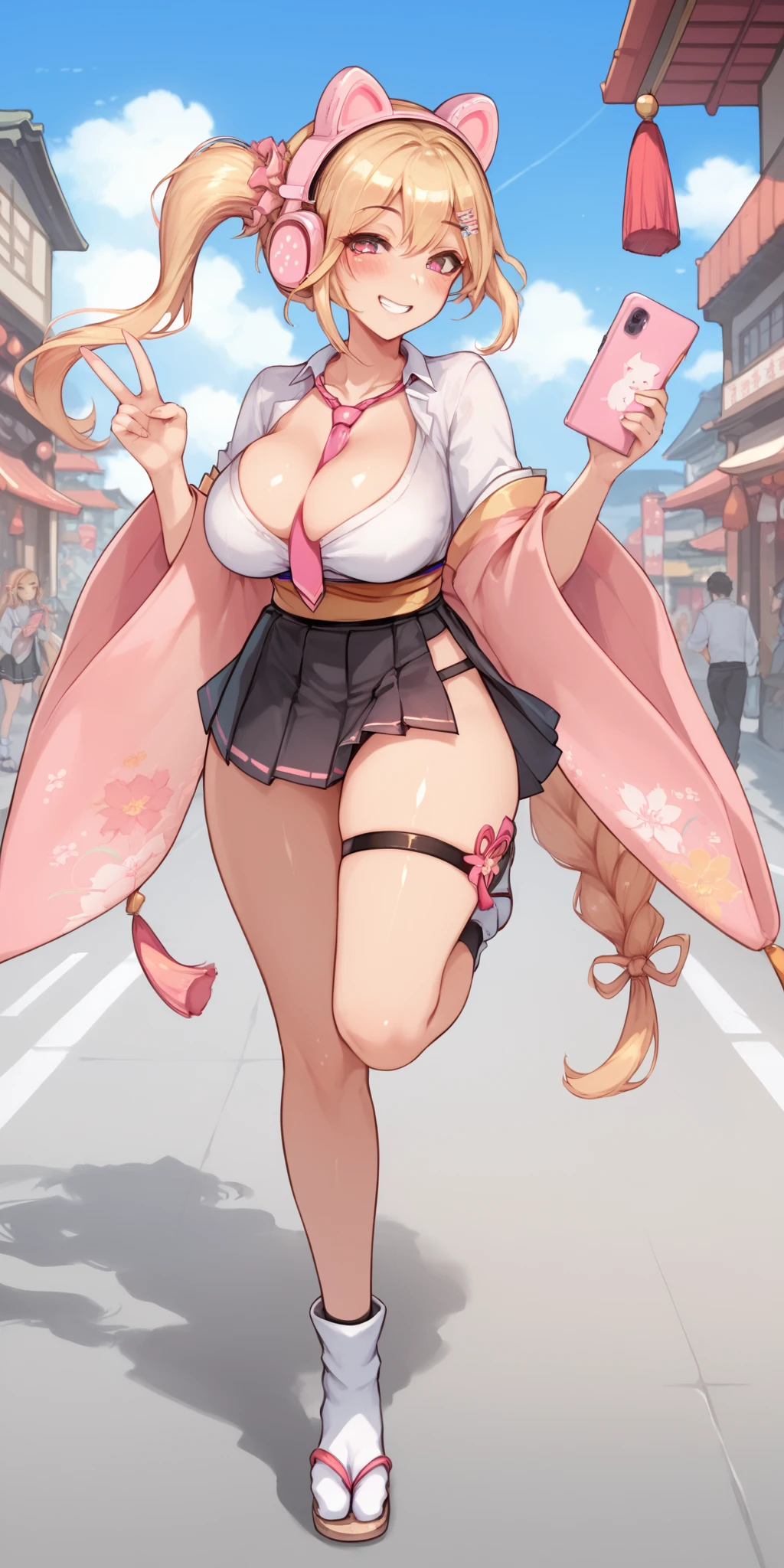 Main tag: sherry,pink eyes,blonde hair,two-tone hair,very long hair, animal ear headphones, pink headphones,bear ears, brown tail.