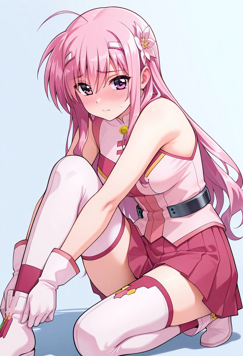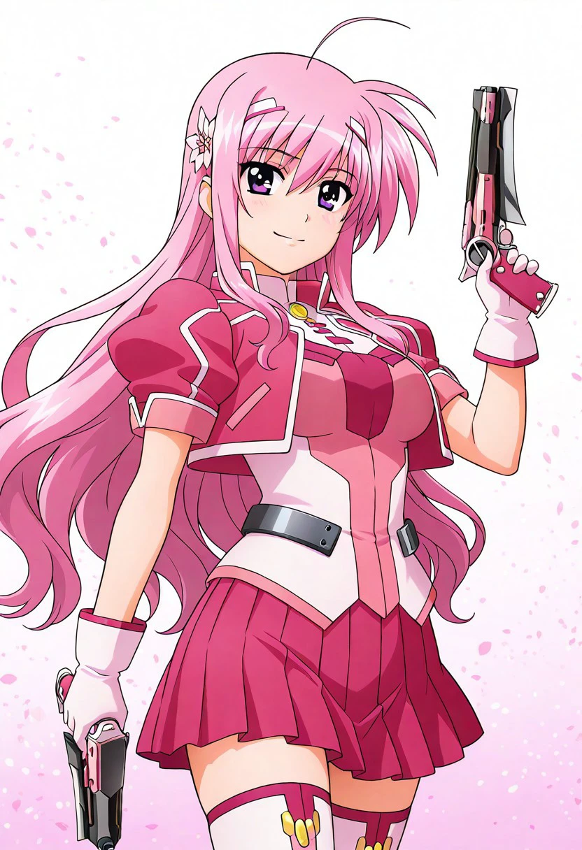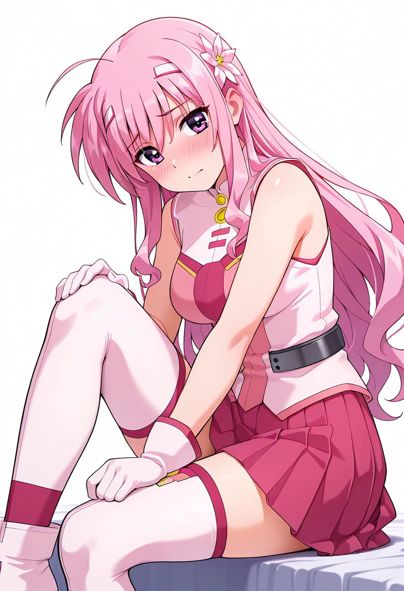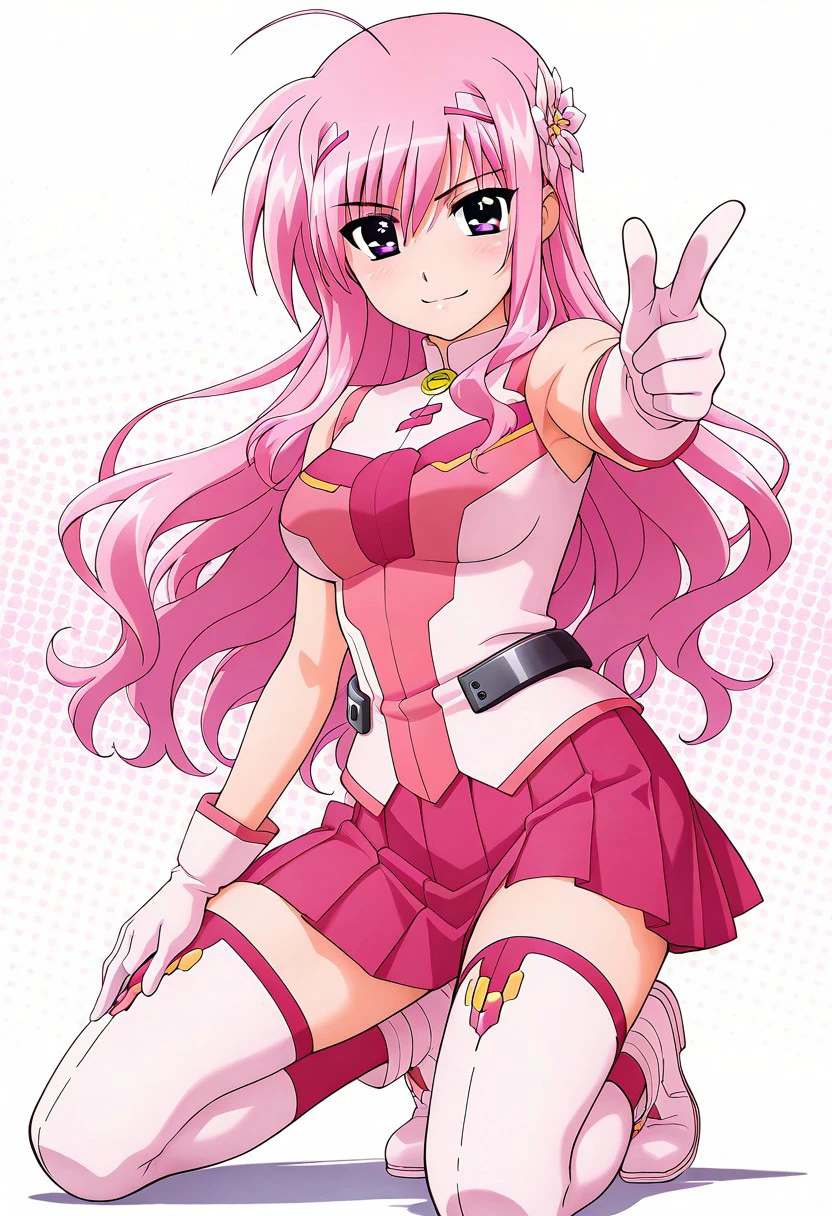Kyrie: solo, 1girl, kyrie florian, pink hair, long hair, twin hairclips, white hairclips, flower, pink eyes