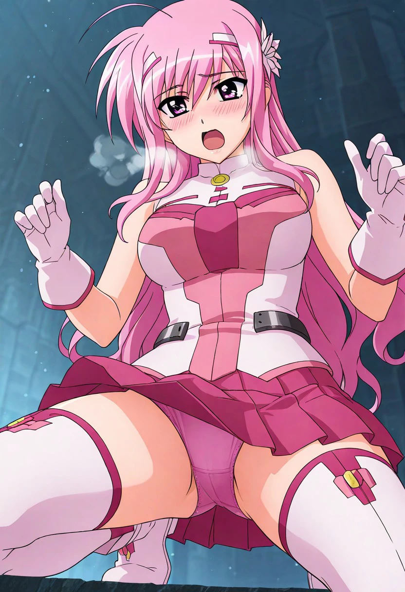 Their Barrier Jacket: cropped jacket, blue/pink jacket with white trim, puffy sleeves, short sleeves, open jacket, white and blue/pink shirt with pink/gold accents, pink/blue skirt, pleated skirt, white gloves with blue/pink trim, white and blue/pink thighhighs with pink/yellow accents, white and blue/pink boots with pink/yellow accents
