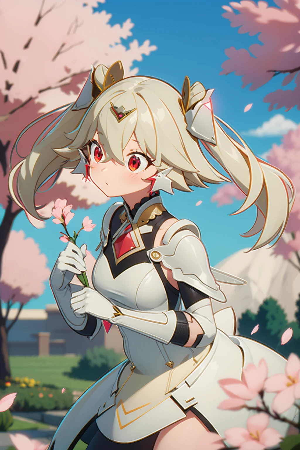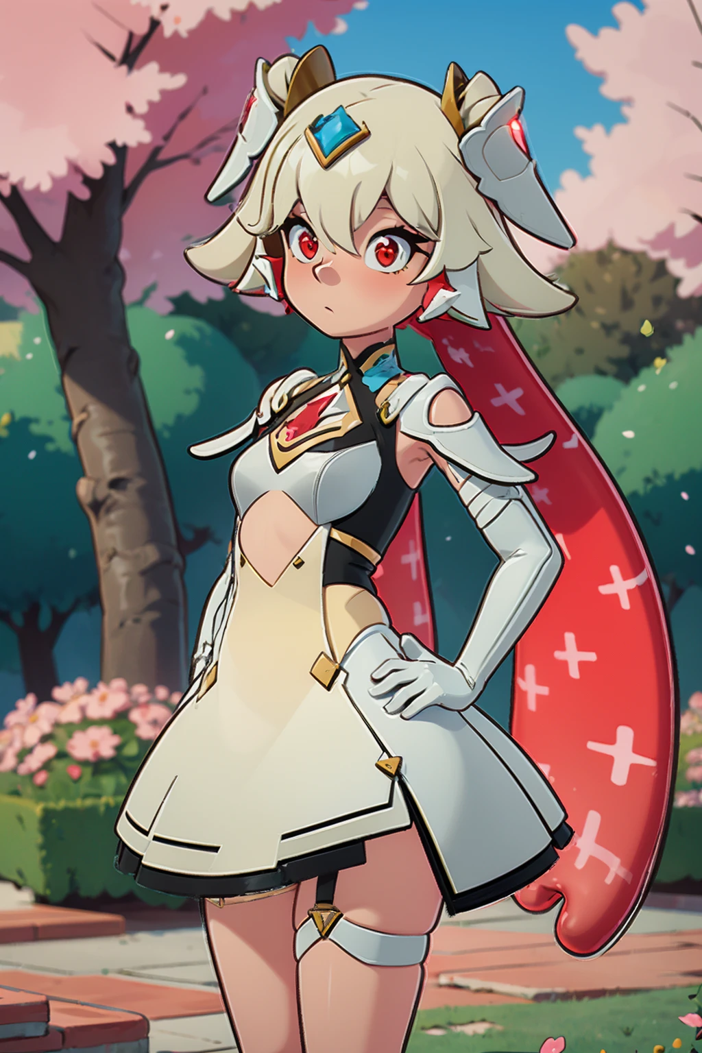 Use tag - rubytoff, white hair, hair ornament, twintails, hair between eyes, red eyes, bangs, gloves, white gloves, white dress and other at lora info