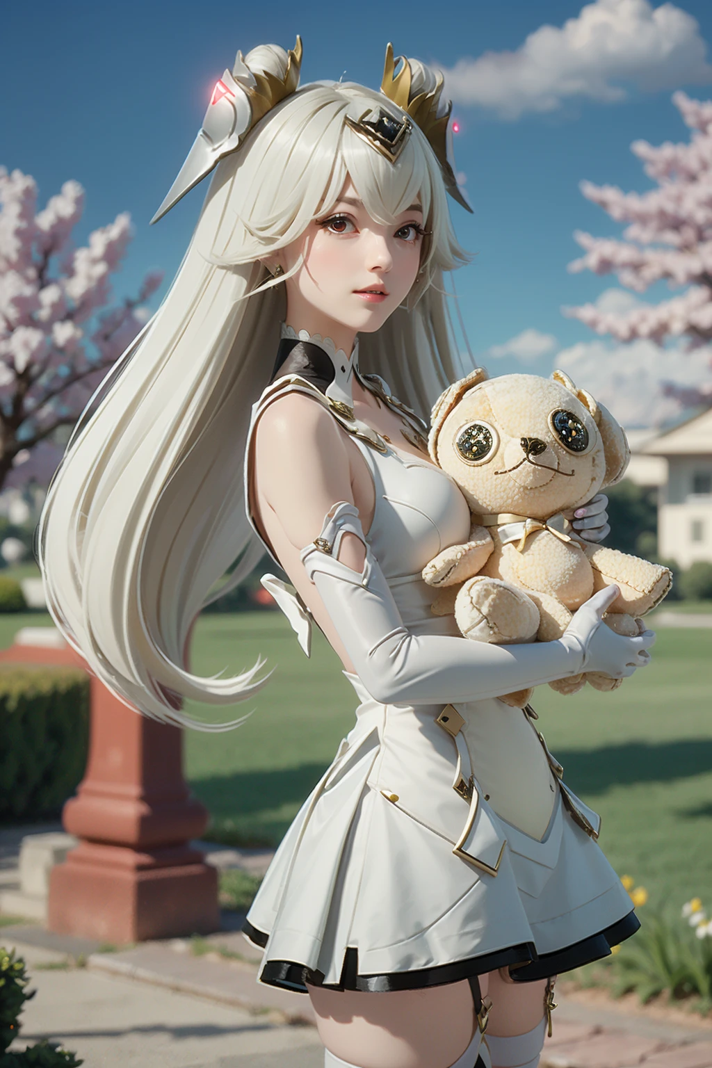 rubytoff, bangs, red eyes, hair ornament, white hair, dress, closed mouth, looking at viewer, hair between eyes, grey hair, twintails, bare shoulders, short hair, gloves, white dress, stuffed toy, stuffed animal, white gloves, holding, holding stuffed toy, white footwear, long hair, shoes, breasts, eyepatch, bandages, small breasts, stuffed bunny, thigh strap, hair bun, double bun, hood, bandaged arm, one eye covered, bandage over one eye, cloak, object hug, doll hug, blush, animal ears, black shorts, elbow gloves, jewelry, parted lips, hood up, button eyes, smile, animal hood, tail, rabbit ears, rabbit tail, rabbit hood, shorts, short sleeves, earrings, hooded cloak, sleeveless, leg up, standing on one leg, chinese clothes, armor, gauntlets, armpits, bike shorts, sidelocks, :o, orange eyes, halo, crossed bangs, blonde hair, underwear, panties, ass, thighs, lying, barefoot, black footwear, black dress, high heels, feet, legs, black panties, bare legs, toes, gold trim, shoes removed, outstretched arms, cross, plant, spread arms, hair over one eye, barcode, barcode tattoo, doll, holding doll, covered mouth, sleeveless dress, mountain, arm up, very long hair, closed eyes, cape, arms up, looking up, ponytail, wings, mask, ribbon, detached sleeves, multicolored hair, fingerless gloves, see-through, crossed arms, flat chest, leotard, covered navel, white leotard, bandaged leg, white cloak