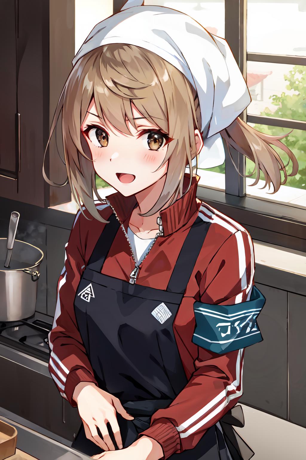 MichishioSanmaKC, (red) jacket, (track) jacket, (green) armband, (black) apron, bandana, (red) pants