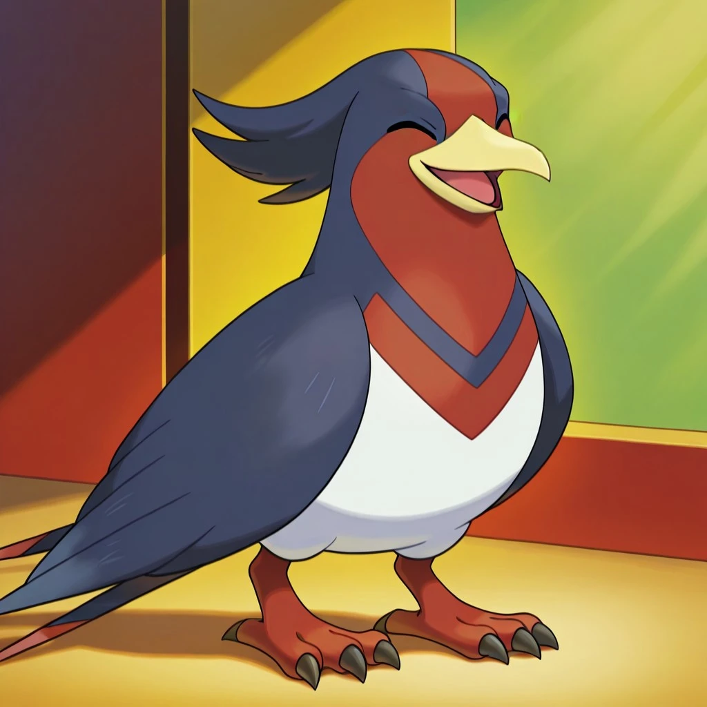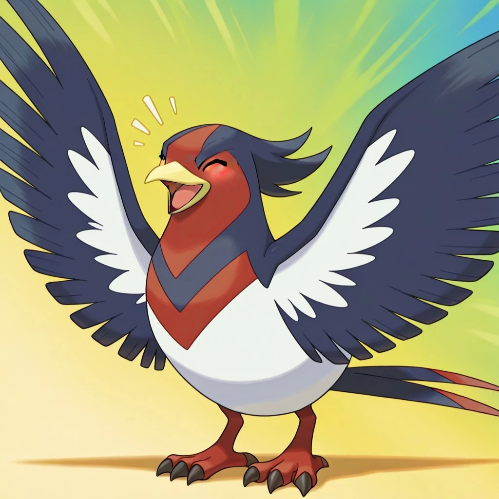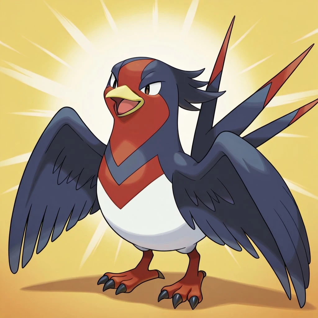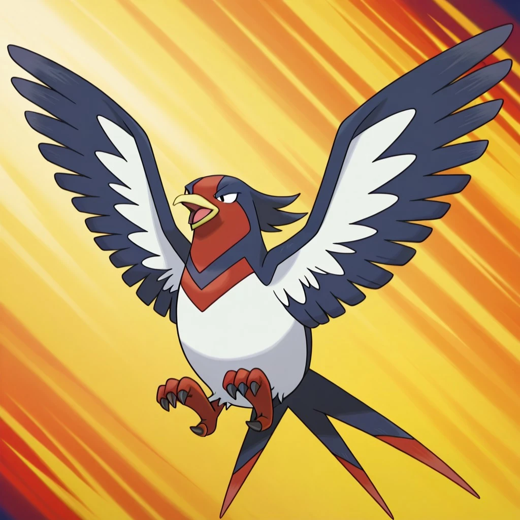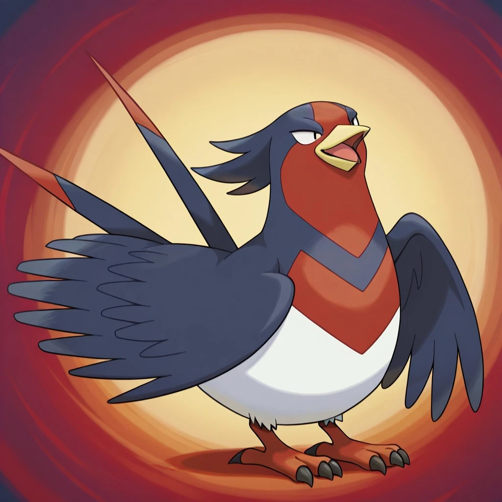 swellow, pokemon (creature), dark blue feathers, white underside, red feet, black claws, yellow beak, red markings on face, two tails