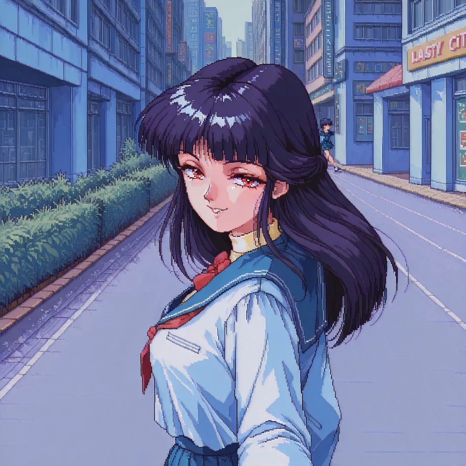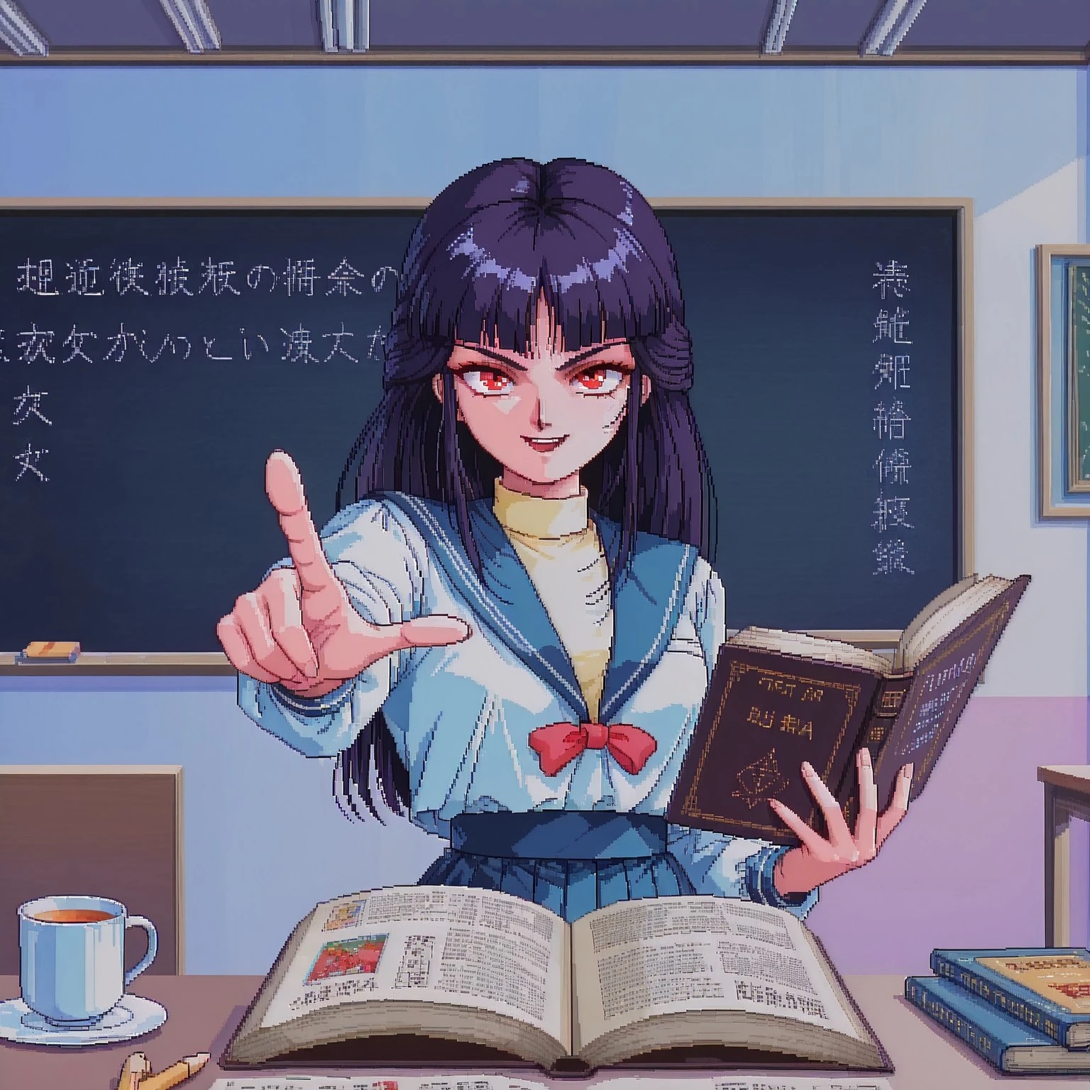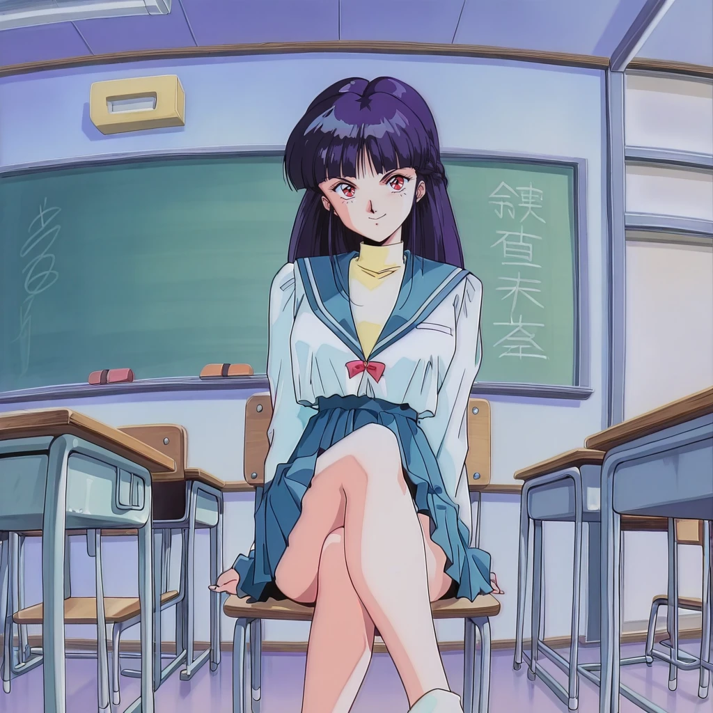 SaekoTKIL, school_uniform, retro_artstyle, red eyes,