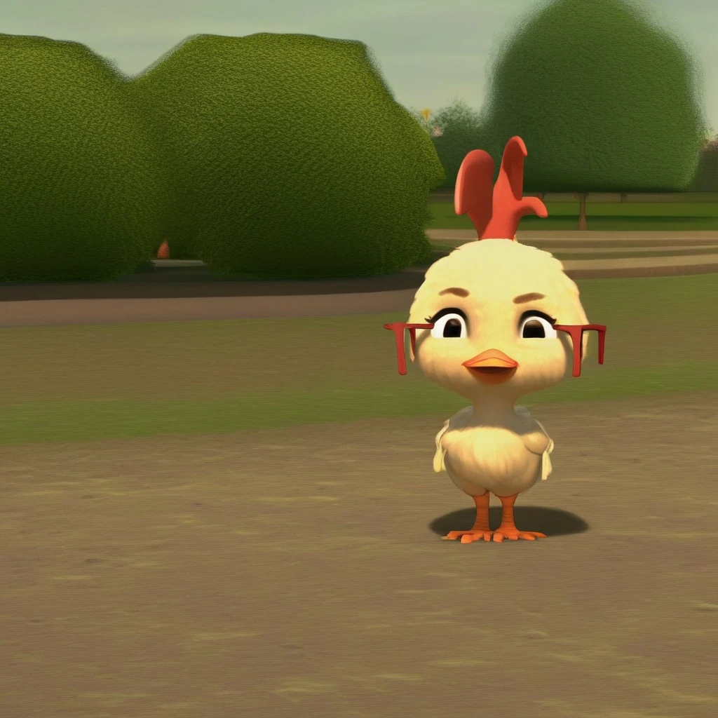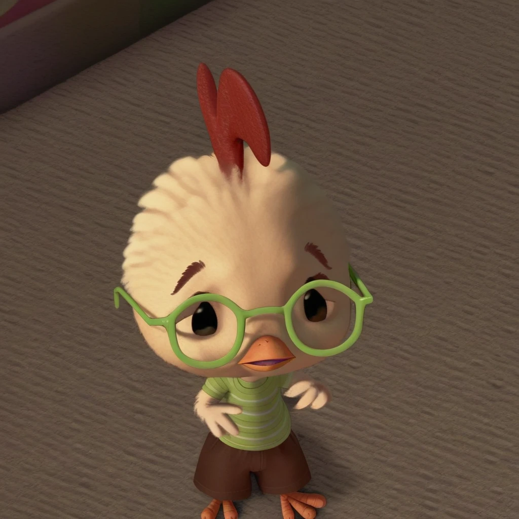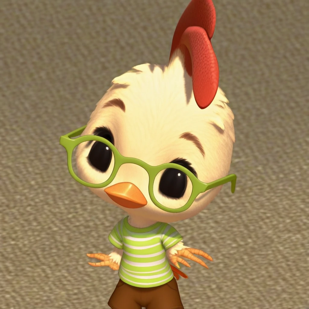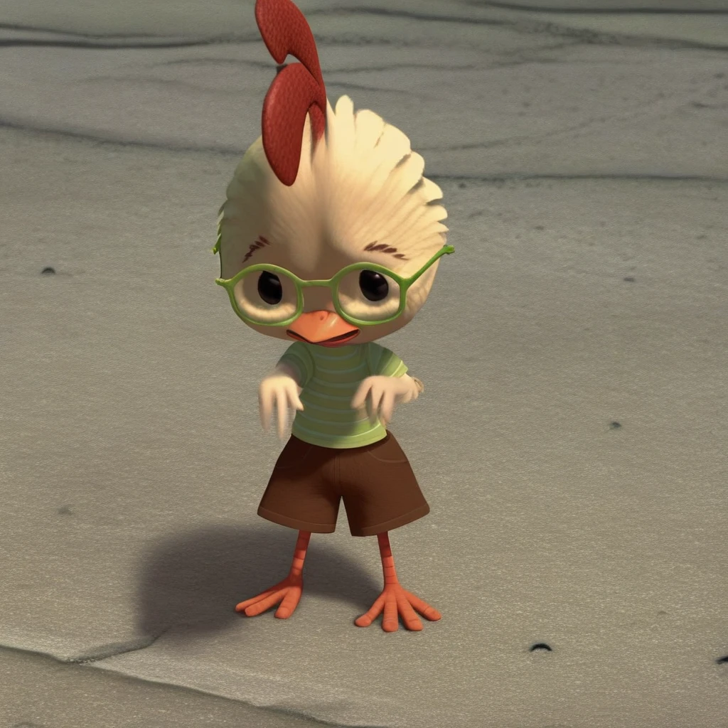 Chicken_Little, chicken, anthro, feathers, 1boy, black eyes, green glasses, striped shirt, brown shorts, tiny male, beak