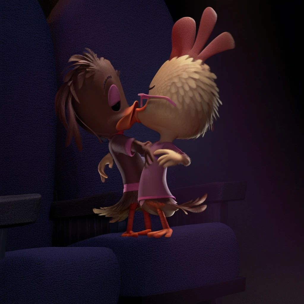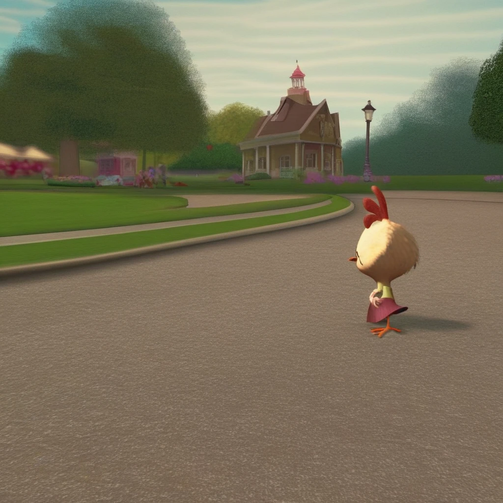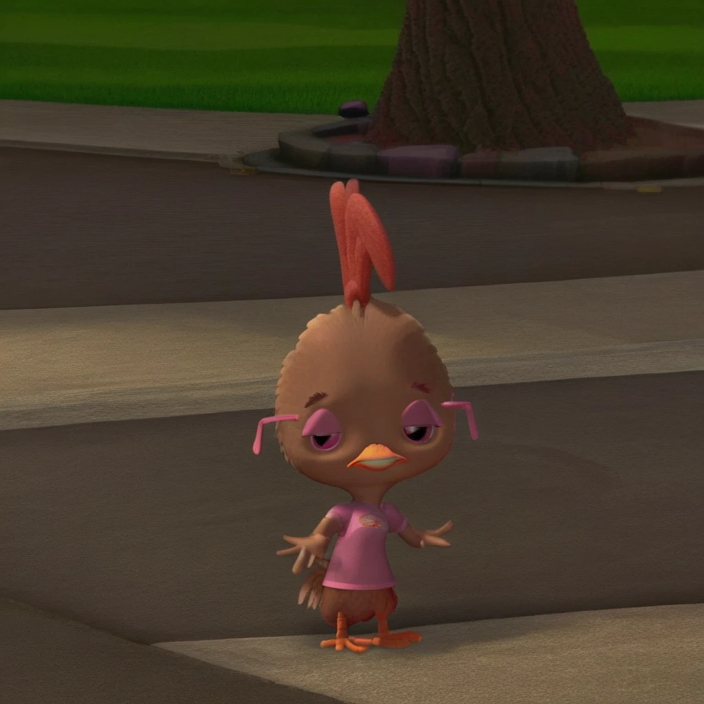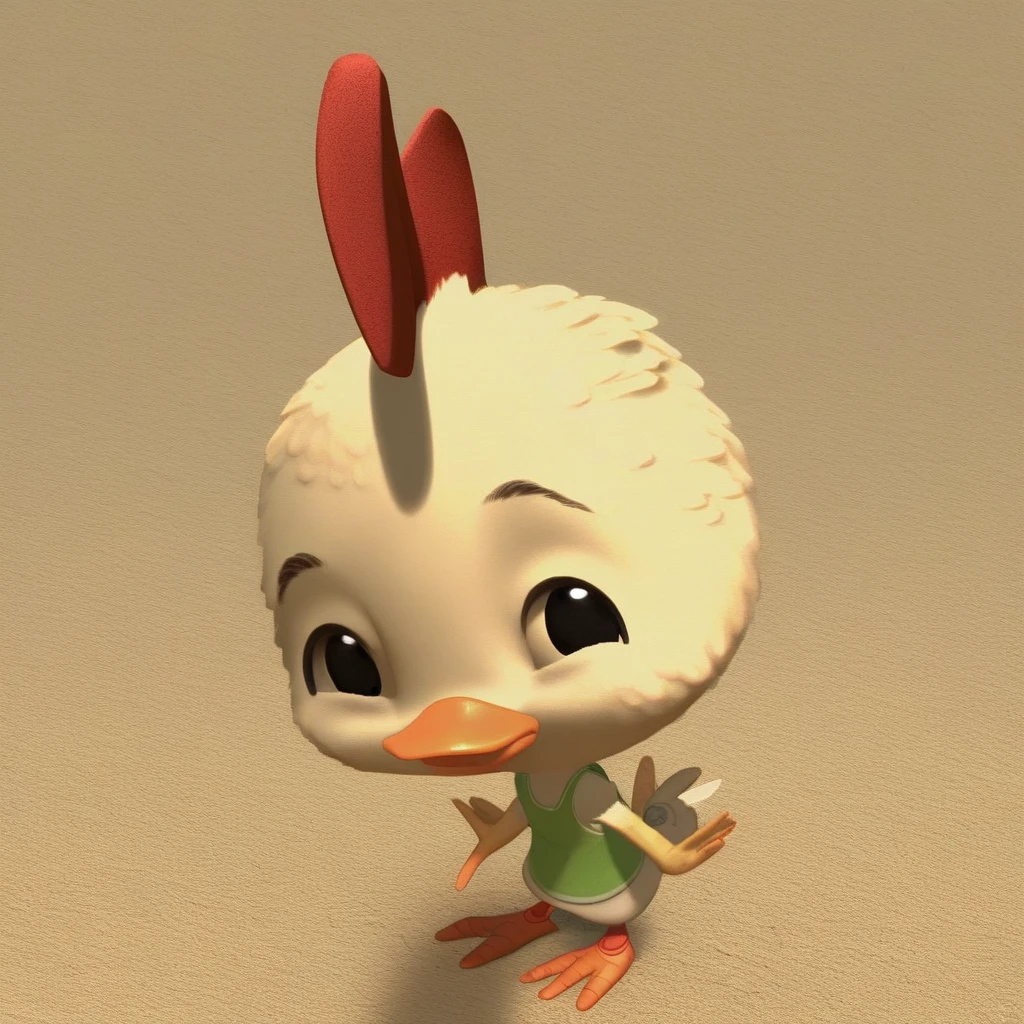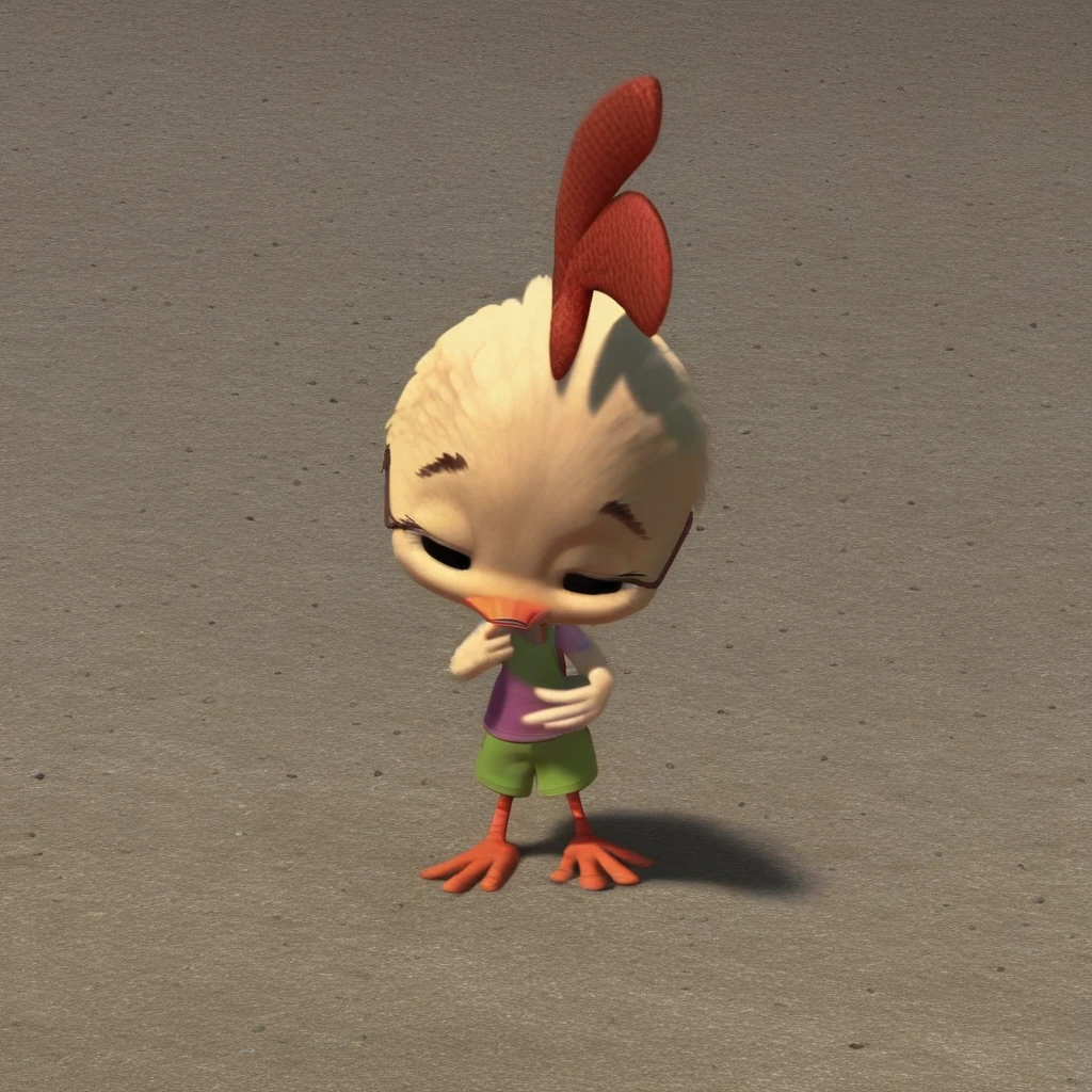 Chicken_Little, chicken, anthro, feathers, 1boy, black eyes, green glasses, striped shirt, brown shorts, tiny male, beak, underwear, origami paper shorts, Abby Mallard