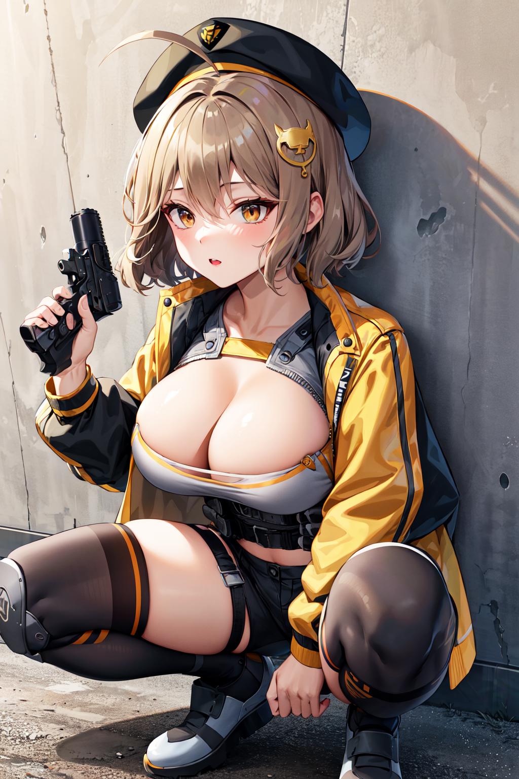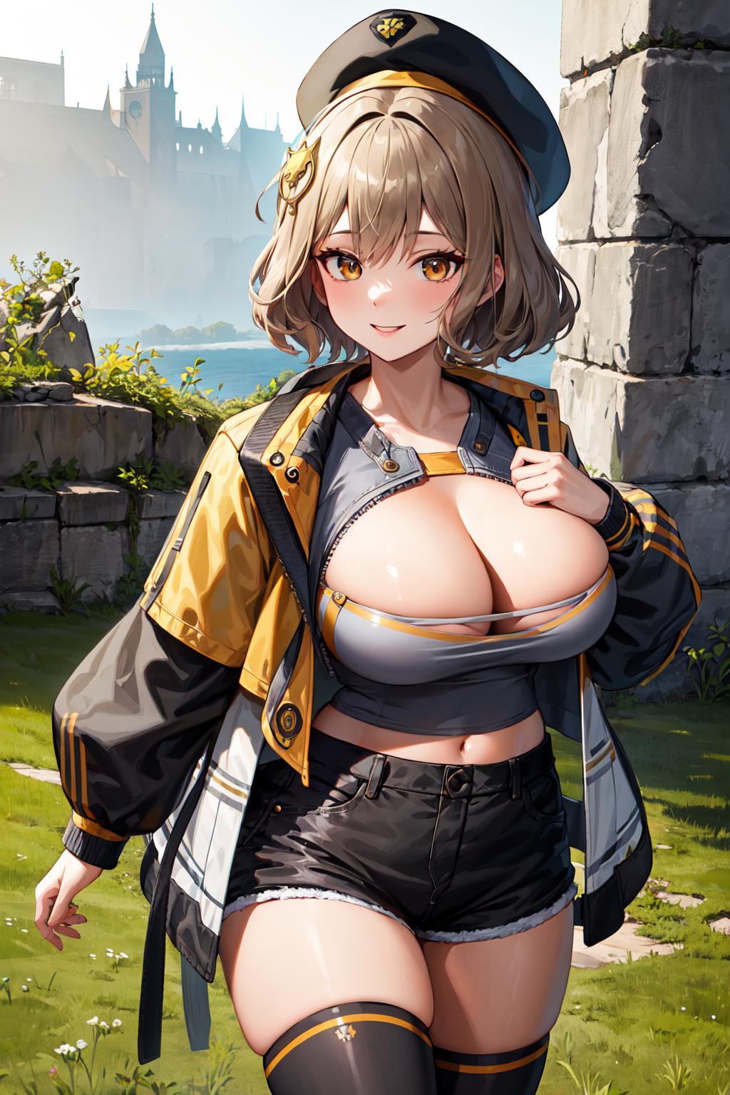 outfit1hmanis, short hair, ahoge, hat, beret, hair ornament, cleavage, grey shirt, crop top, black jacket, open jacket, long sleeves, black shorts, short shorts, black thighhighs, knee pads