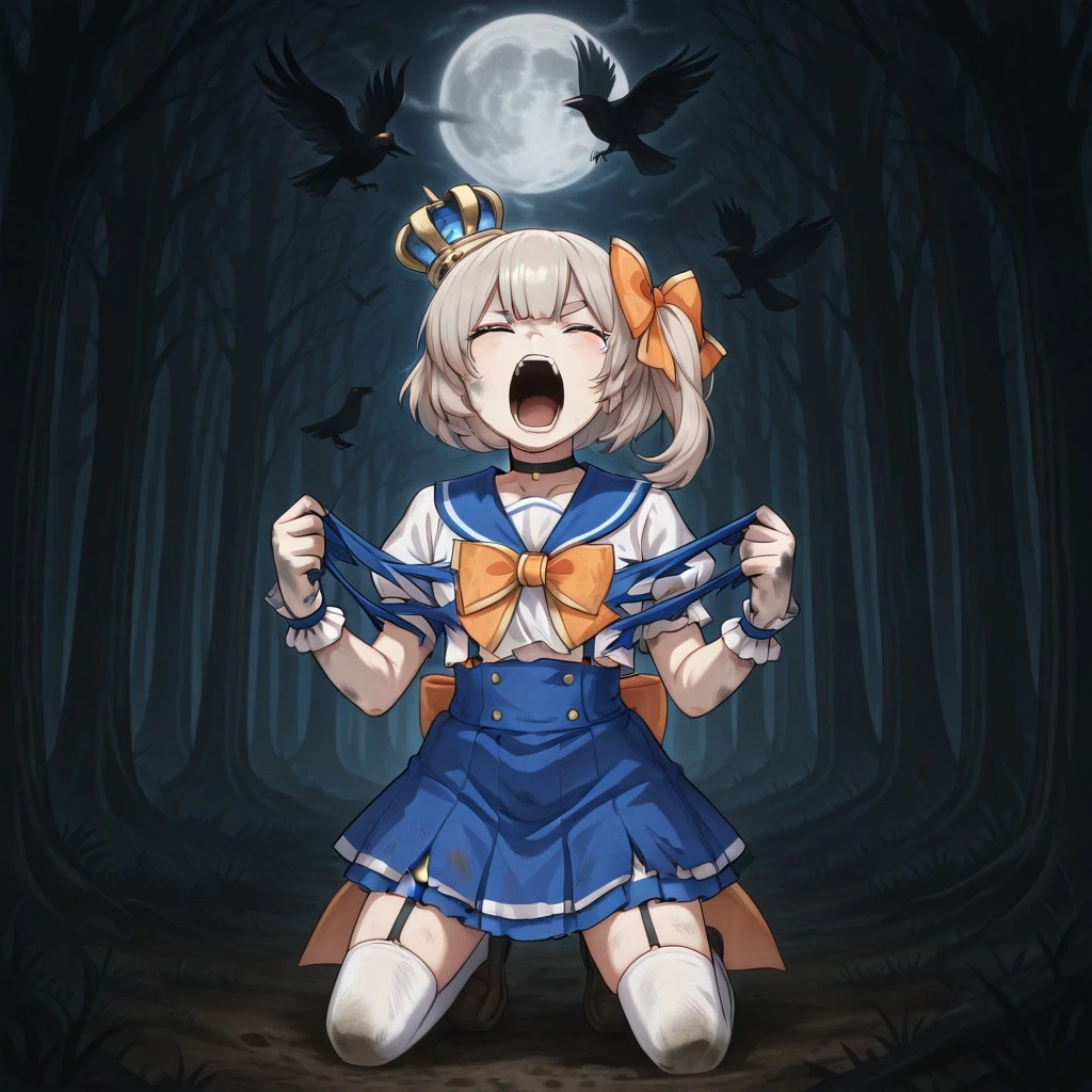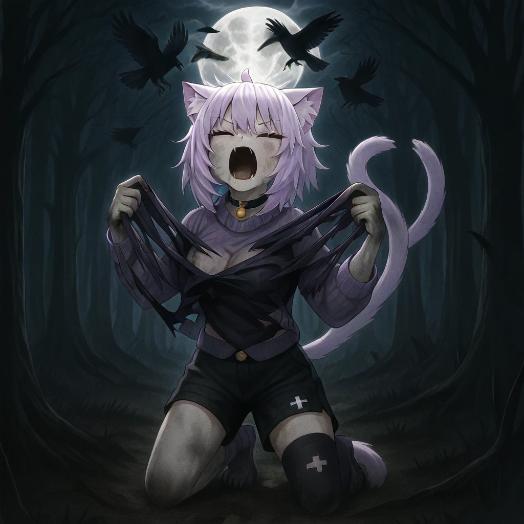 h0wling, closed eyes, teeth torn clothes, dirty, tearing clothes, straight-on, kneeling, open mouth, screaming, shouting, forest, nature, outdoors, night, full moon, moon, sky, tree, bird, crow,