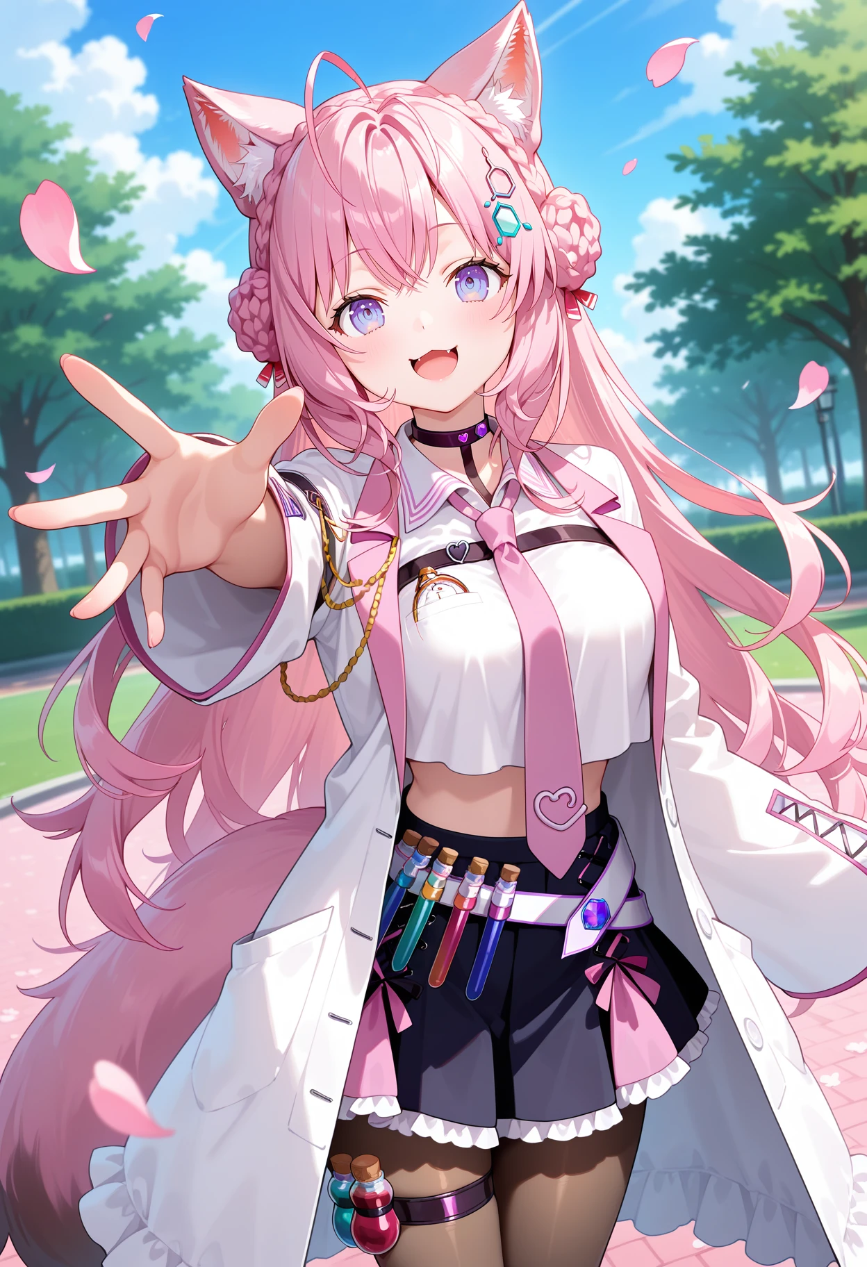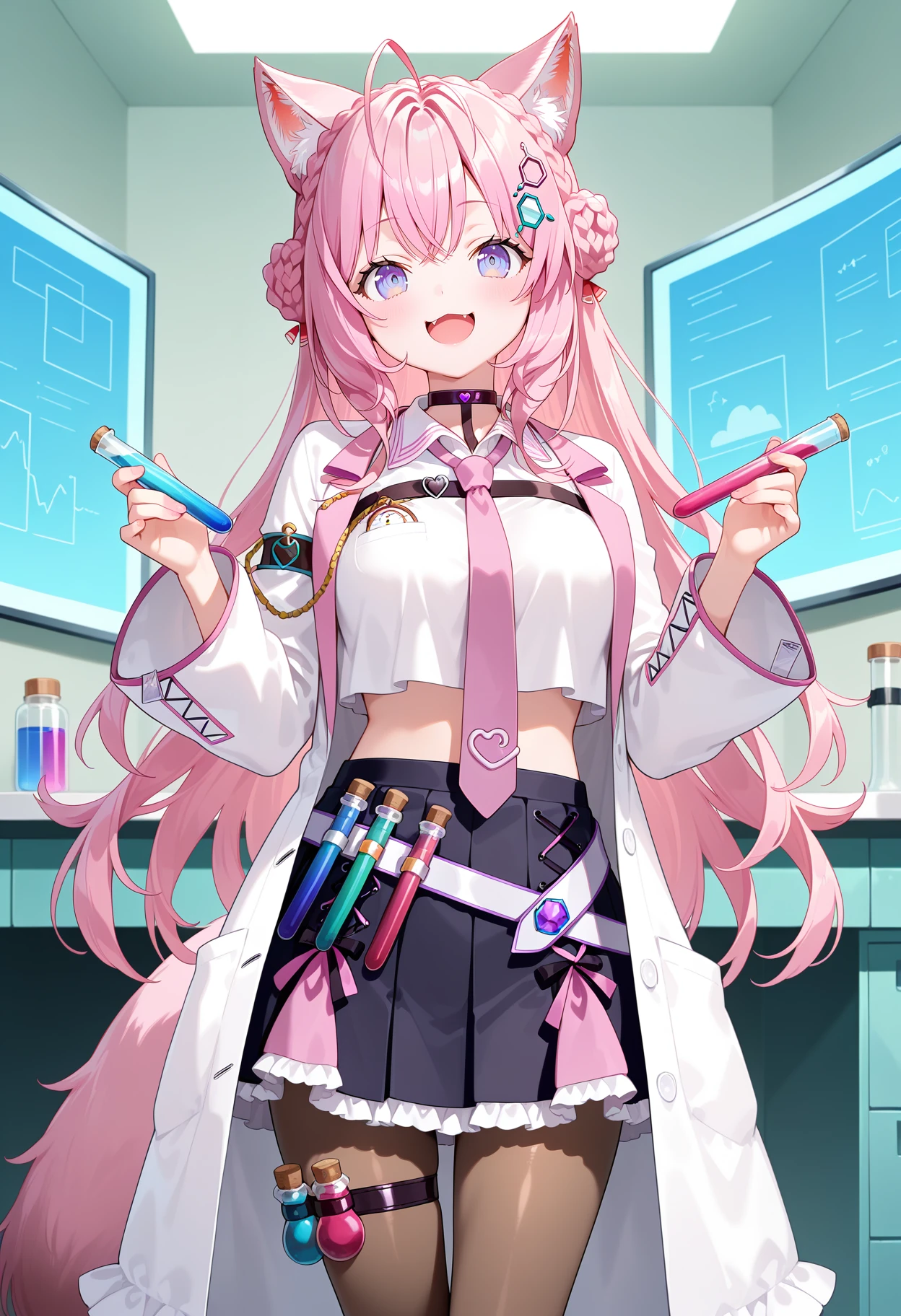 outfit1-1aakoyori, long hair, pink hair, braided bun, animal ears, hair ornament, fang, tail, black choker, pink necktie, crop top, collared shirt, white shirt, lab coat, long sleeves, white belt, frilled skirt, black skirt, thigh strap, brown pantyhose