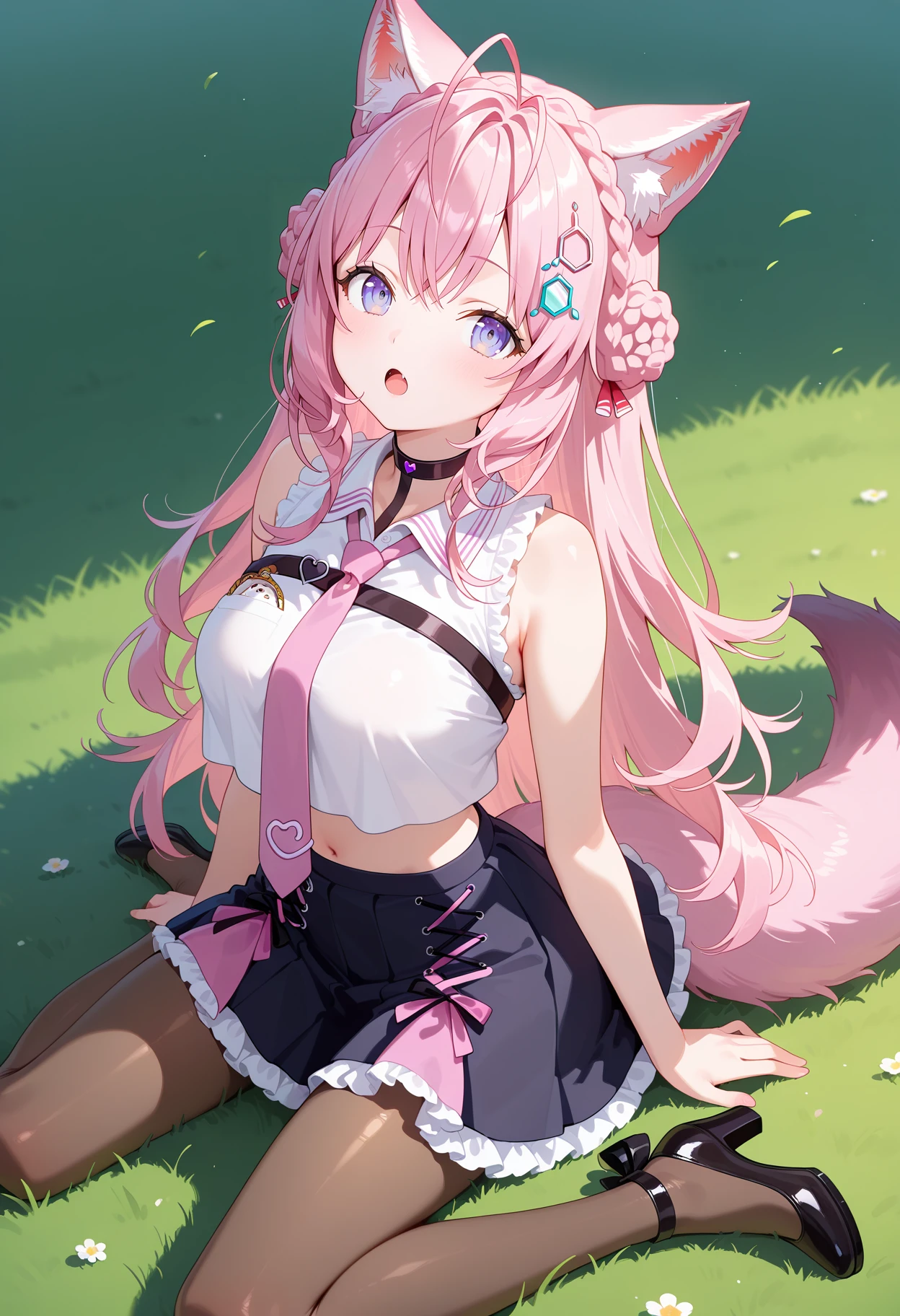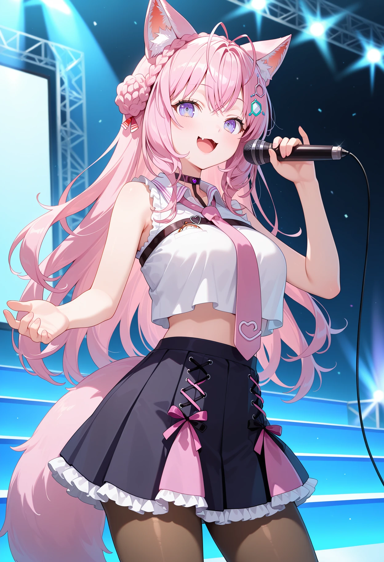 outfit1-2aakoyori, long hair, pink hair, braided bun, animal ears, hair ornament, fang, tail, black choker, pink necktie, crop top, collared shirt, white shirt, sleeveless, bare arms, frilled skirt, black skirt, brown pantyhose