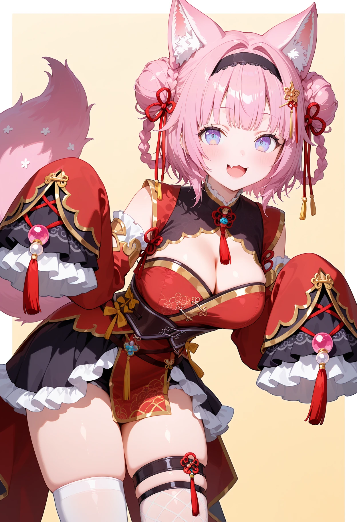 outfit7ffkoyori, short hair, pink hair, braid, double bun, hair rings, animal ears, black hairband, hair ribbon, hair ornament, fang, tail, cleavage cutout, red dress, detached sleeves, frilled sleeves, sleeves past fingers, black skirt, thigh strap, asymmetrical legwear, white thighhighs