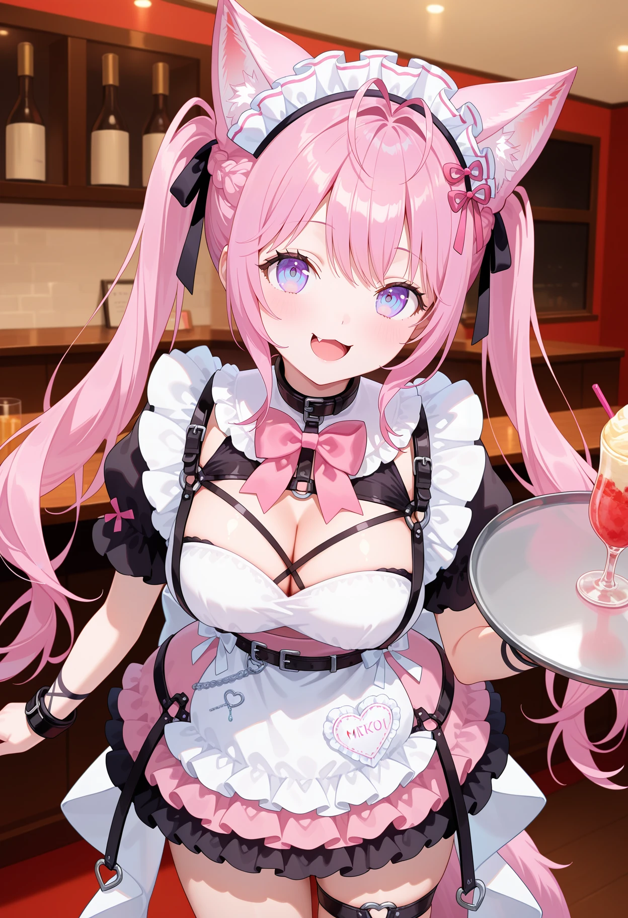 outfit5eekoyori, long hair, pink hair, twintails, braid, animal ears, hair ribbon, maid headdress, fang, tail, black collar, pink bowtie, cleavage, chest harness, black dress, short sleeves, frilled apron, white apron, layered skirt, pink skirt, thigh strap