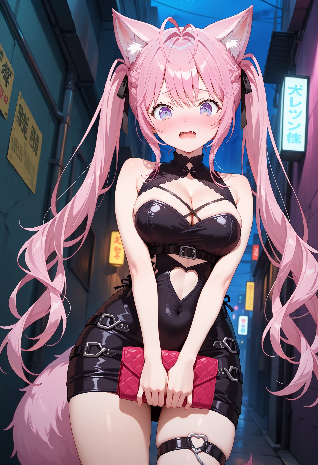outfit6eekoyori, long hair, pink hair, twintails, braid, animal ears, hair ribbon, fang, tail, cleavage, clothing cutout, bodycon, short dress, black dress, sleeveless, black belt, thigh strap